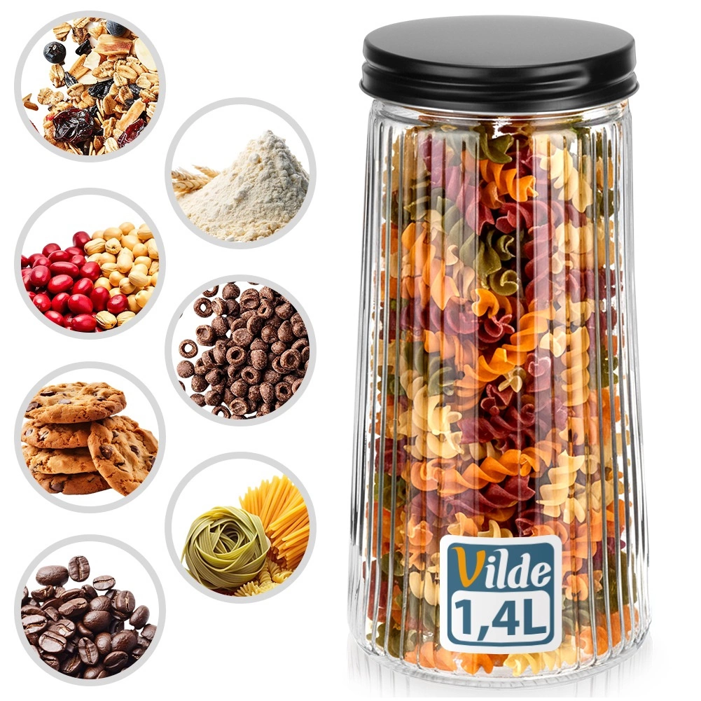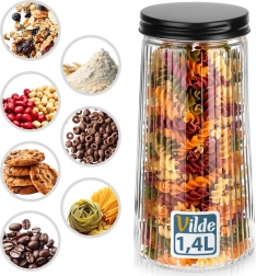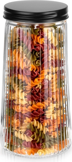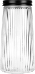 Κομψό γυάλινο δοχείο χωρητικότητας 1,4 l με μαύρο βιδωτό καπάκι που διατηρεί τα τρόφιμά σας φρέσκα για περισσότερο. Είναι κατασκευασμένο από ανθεκτικό βοριοπυριτικό γυαλί με διακοσμητικές ραβδώσεις, που εξασφαλίζουν στιλάτη εμφάνιση και ασφαλές κράτημα. Χάρη στο αεροστεγές κλείσιμο είναι ιδανικό για καφέ, ζυμαρικά, αλεύρι, ξηρούς καρπούς ή μούσλι και το διάφανο γυαλί επιτρέπει γρήγορο έλεγχο του περιεχομένου.