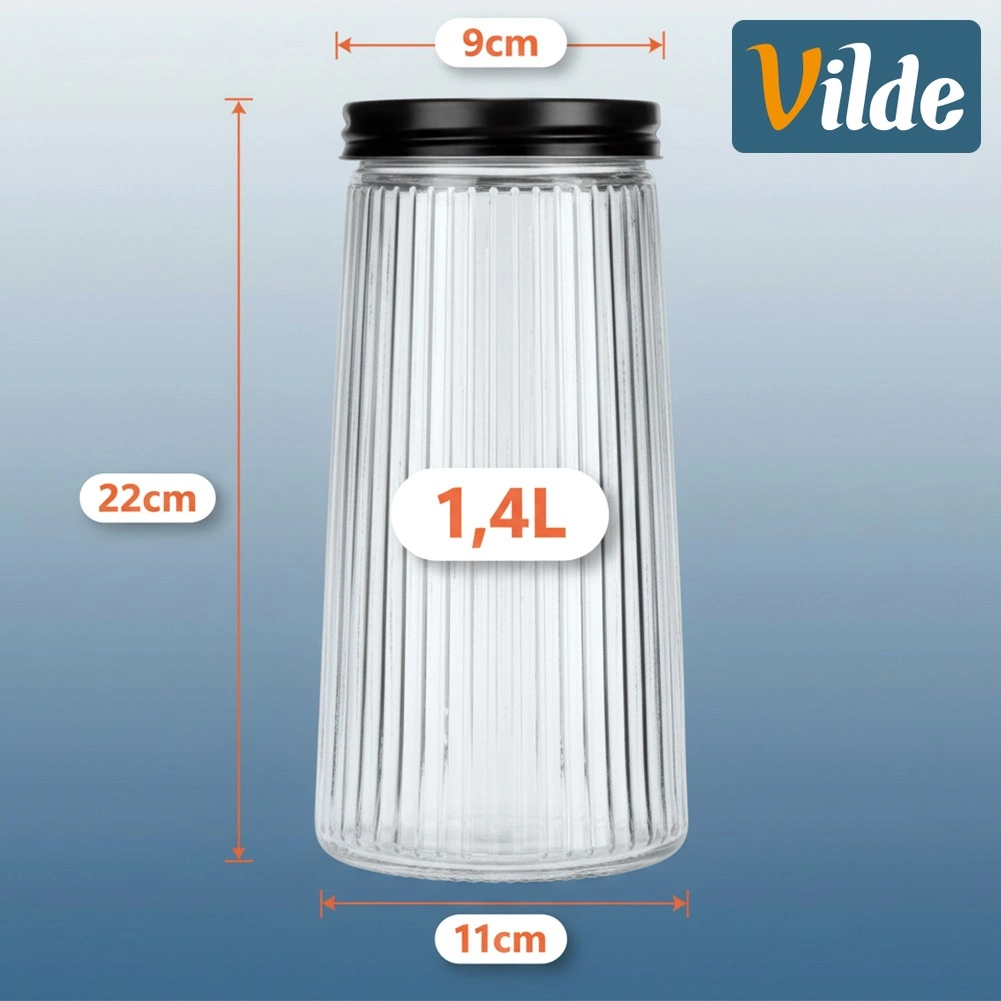 Αυτό το πρακτικό και καλαίσθητο δοχείο κουζίνας χωρητικότητας 1,4 l βοηθά να διατηρείτε το ντουλάπι σας οργανωμένο και τα τρόφιμα φρέσκα. Το υψηλής ποιότητας βοριοπυριτικό γυαλί αντέχει σε θερμικές μεταβολές και η ριγέ επιφάνεια προσφέρει μοντέρνα εμφάνιση και καλύτερη σταθερότητα στο χέρι. Το βιδωτό μεταλλικό καπάκι σε μαύρο χρώμα εξασφαλίζει στεγανό κλείσιμο και προστατεύει το άρωμα και την τραγανότητα των υλικών.