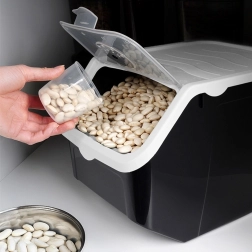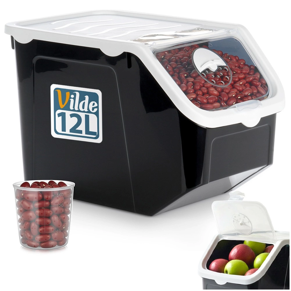 Πρακτικό δοχείο κουζίνας χωρητικότητας 12 l για φρούτα, λαχανικά και ξηρά τρόφιμα. Διαθέτει ρύθμιση αερισμού στο καπάκι, διάφανη αναδιπλούμενη θυρίδα για εύκολη δοσομέτρηση και στεγανό καπάκι για μεγαλύτερη φρεσκάδα. Περιλαμβάνεται δοσομετρητής 40–160 ml. Κατασκευασμένο από ασφαλές πλαστικό χωρίς BPA, κατάλληλο για επαφή με τρόφιμα, για κατάψυξη και πλυντήριο πιάτων, με αντοχή θερμοκρασίας -20 °C έως 100 °C.