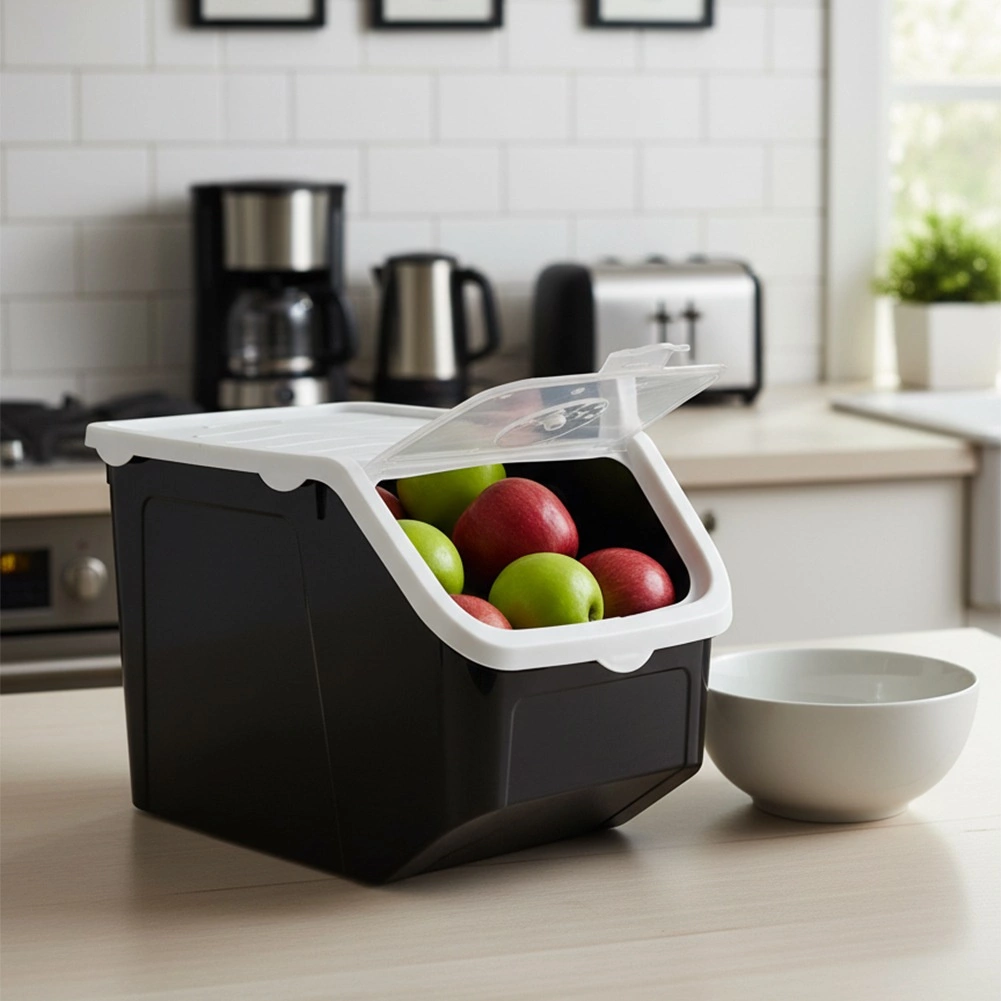 Διατηρήστε τάξη στο ντουλάπι και στον πάγκο με το ευρύχωρο δοχείο 12 l. Χάρη στη διάφανη αναδιπλούμενη θυρίδα ελέγχετε γρήγορα το περιεχόμενο και παίρνετε εύκολα την απαιτούμενη ποσότητα. Το λευκό στεγανό καπάκι προστατεύει από υγρασία και οσμές, ενώ ο ρυθμιζόμενος αερισμός βοηθά να παραμένουν τα φρούτα και τα λαχανικά φρέσκα για περισσότερο.
