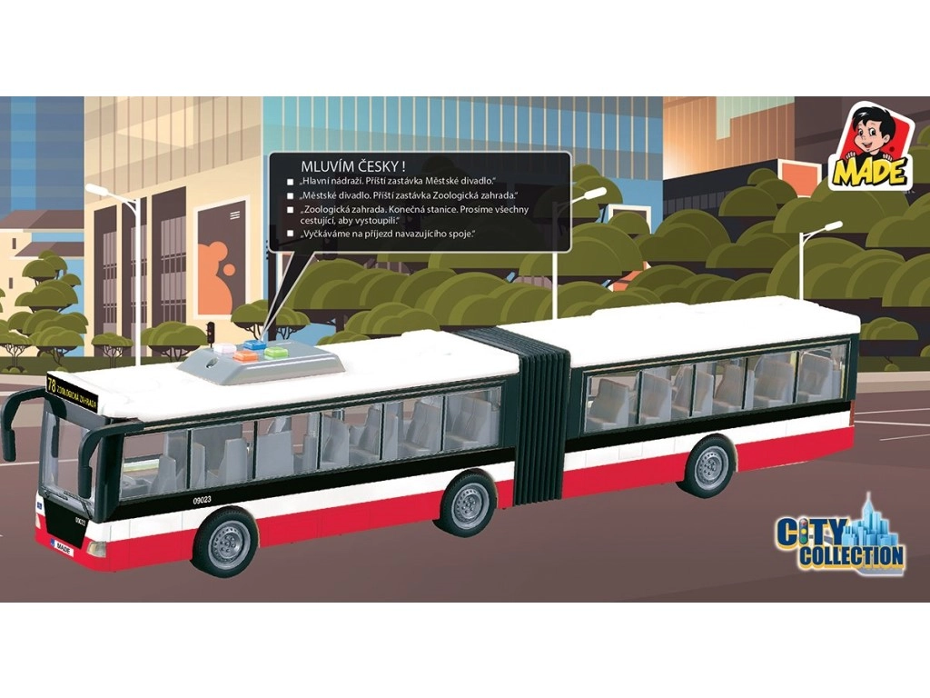 Αρθρωτό αστικό λεωφορείο με κίνηση αδράνειας, με φωτεινά εφέ και τσεχικές ανακοινώσεις στάσεων, που θα ενθουσιάσει όλους τους μικρούς οδηγούς. Προσφέρει εύκαμπτο σύνδεσμο, ρεαλιστικό τσέχικο design και είναι έτοιμο για παιχνίδι αμέσως μετά το άνοιγμα χάρη στις μπαταρίες στη συσκευασία.