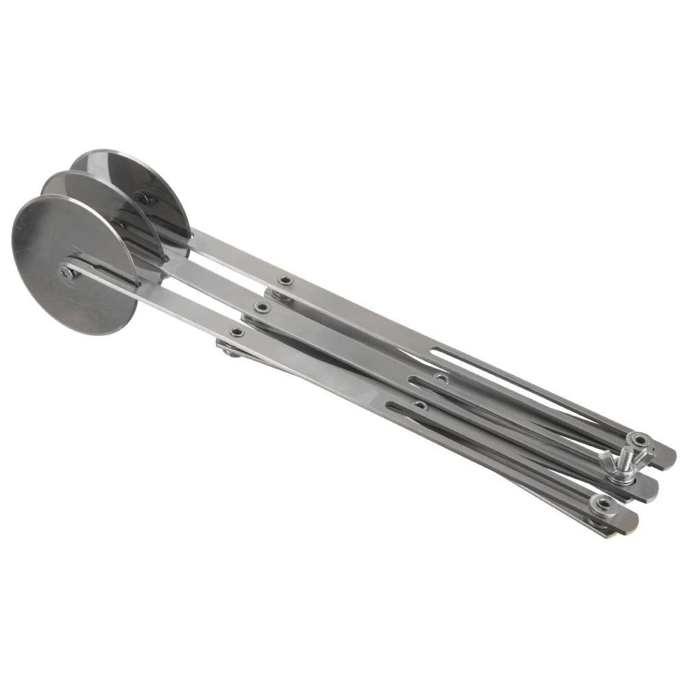 Χάρη στον μηχανισμό ασφάλισης με παξιμάδια πεταλούδα ρυθμίζετε γρήγορα το πλάτος κοπής από 1,3–25 cm και στερεώνετε με ασφάλεια τη μεταξύ τους απόσταση. Ιδανικό για διαίρεση σφολιάτας, κουραμπιέ και ζύμης για ζυμαρικά, καθώς και για χάραξη γραμμών κοπής σε τούρτες και πίτες.