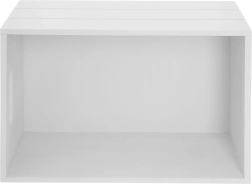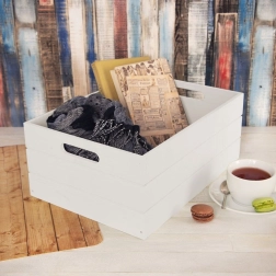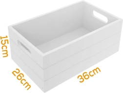 Πρακτικό ξύλινο αποθηκευτικό κιβώτιο σε λευκό χρώμα που σας βοηθά να διατηρείτε την τάξη στο σπίτι και στο γραφείο. Έχει διαστάσεις 36 × 26 × 15 cm, είναι από στιβαρό ξύλο και χάρη στις πλευρικές λαβές μεταφέρεται εύκολα. Είναι ιδανικό για καλλυντικά, είδη γραφείου, αξεσουάρ ντουλάπας ή κουζινικά. Είναι πολυχρηστικό, ανθεκτικό, πολυλειτουργικό και ταυτόχρονα διακοσμητικό.