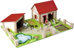 Μεγάλος αχυρώνας με στάβλο, ανοιγόμενες πύλες και περιφράξεις δημιουργούν αυθεντικό περιβάλλον. Τα παιδιά μπορούν να ταΐζουν τα ζώα, να τα οδηγούν στους χώρους βόλτας και να οργανώνουν τη ζωή στη φάρμα.