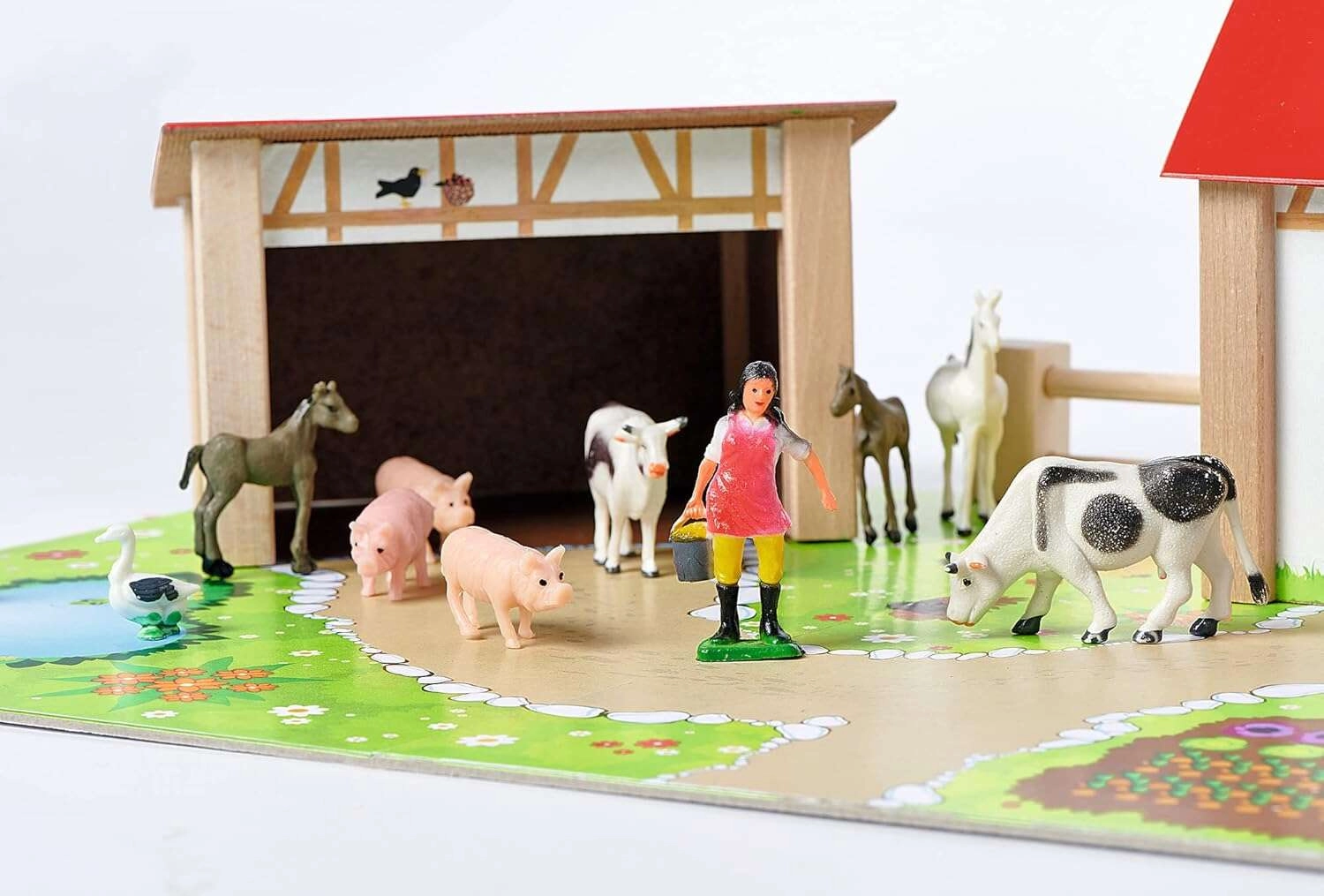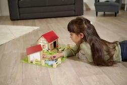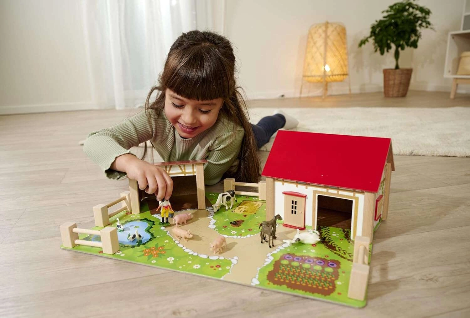 Το σετ περιλαμβάνει μεγάλο σπίτι με περίβολο και στάβλο, πολύχρωμη βάση 51 × 36 cm, περιφράξεις και 12 φιγούρες ζώων και αγρότη. Το παιχνίδι ενισχύει τον συντονισμό, τη μάθηση χρωμάτων και σχημάτων καθώς και την αναγνώριση αγροτικών ζώων.