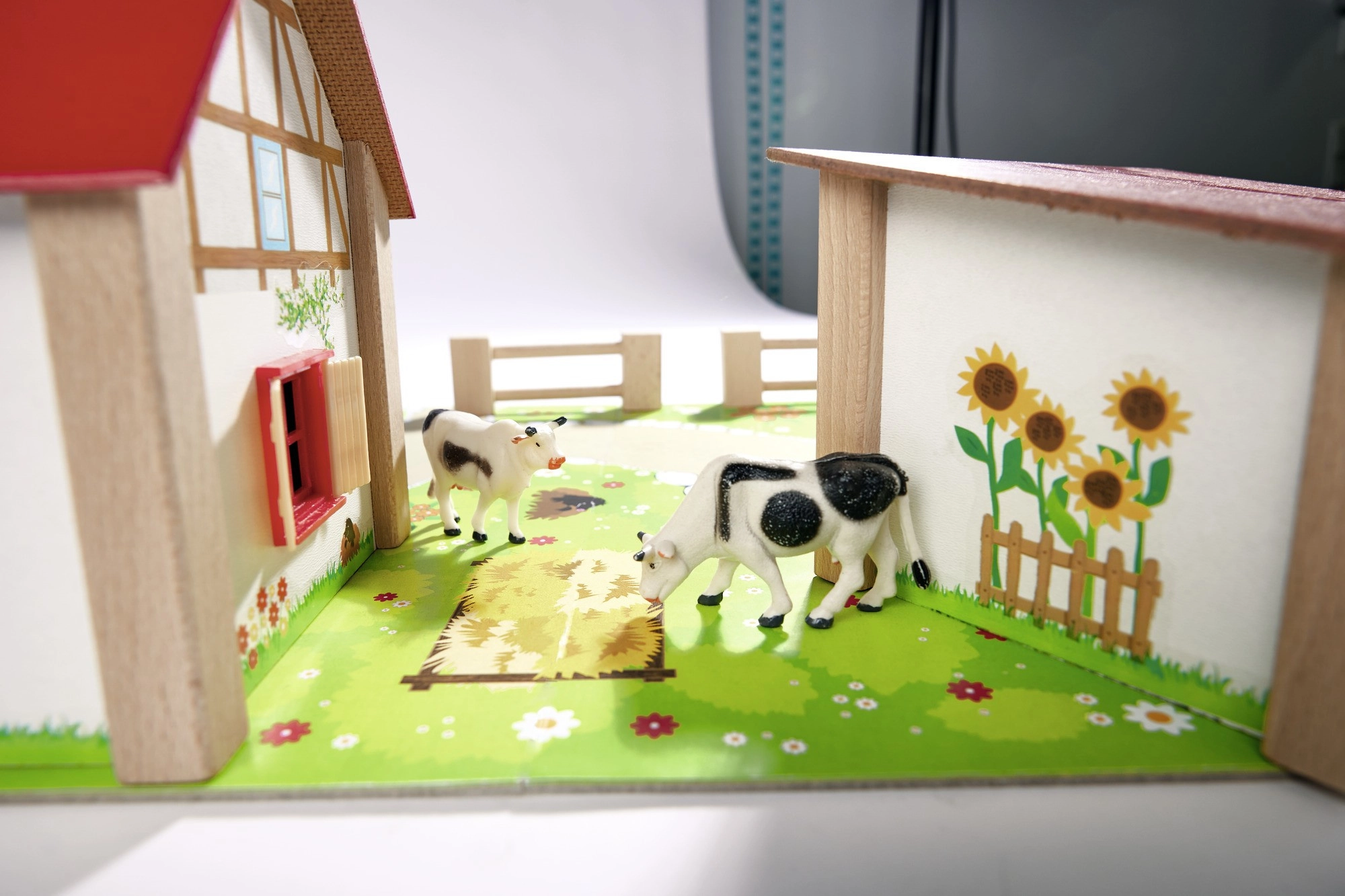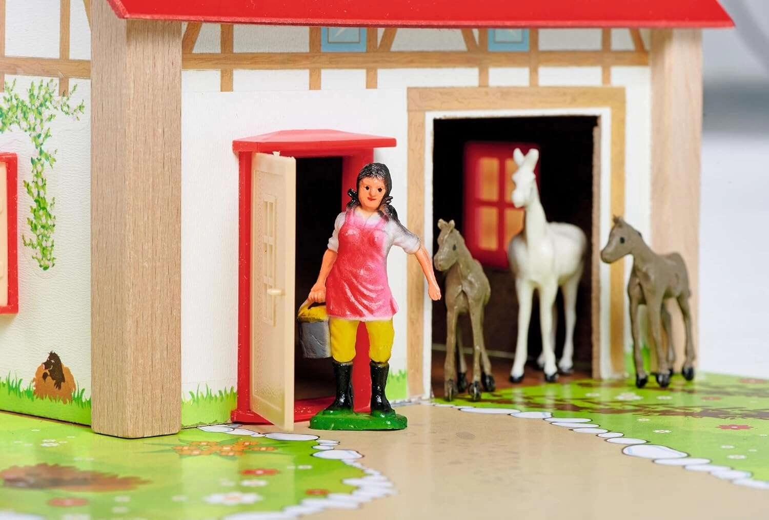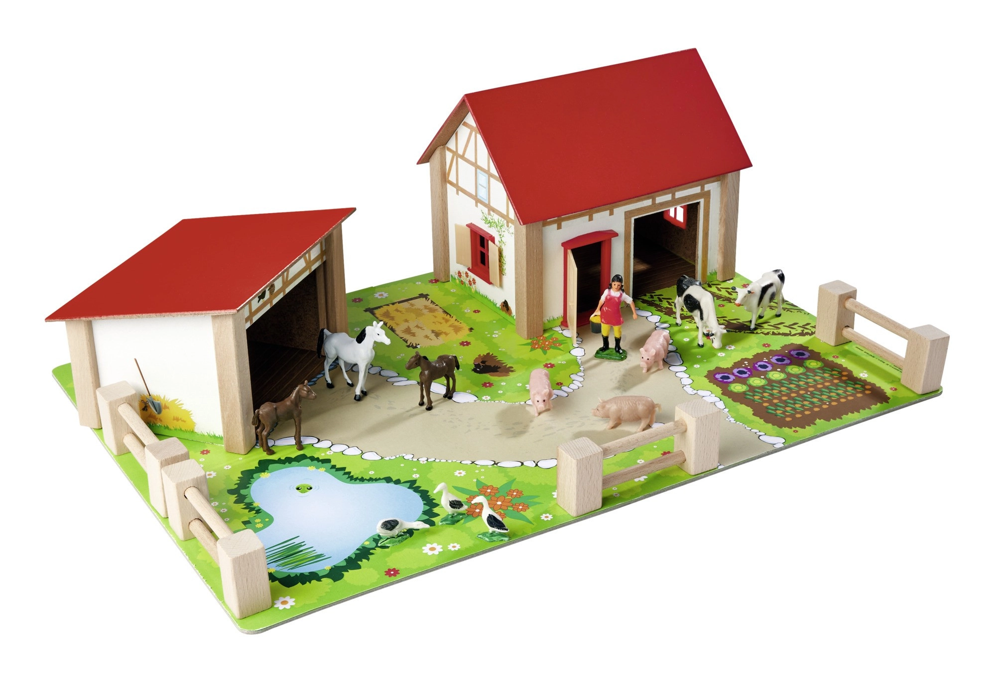 - Σπίτι με αχυρώνα και στάβλο, πολύχρωμη βάση, φράχτες, αυτοκόλλητα, 12 φιγούρες (ζώα και φιγούρα αγρότη)