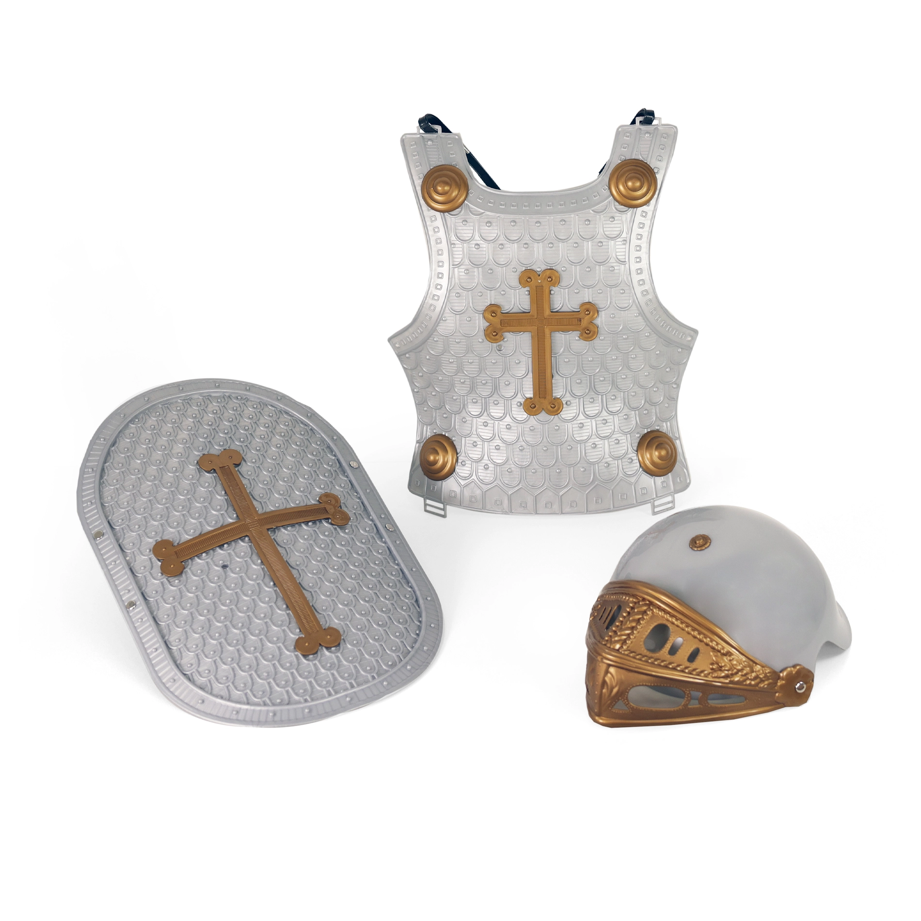 Το ιπποτικό σετ για παιδιά είναι η ιδανική επιλογή για κάθε παιδί που ονειρεύεται περιπέτειες ως μεσαιωνικός υπερασπιστής. Το σετ περιλαμβάνει πλαστικό σπαθί με ασημένια θήκη, προστατευτική ασπίδα, κράνος με ρυθμιζόμενο προφύλαγμα και ιπποτικό γιλέκο. Κάθε κομμάτι είναι σχεδιασμένο ώστε να φαίνεται αυθεντικό και ταυτόχρονα να είναι ασφαλές για τα παιδιά.