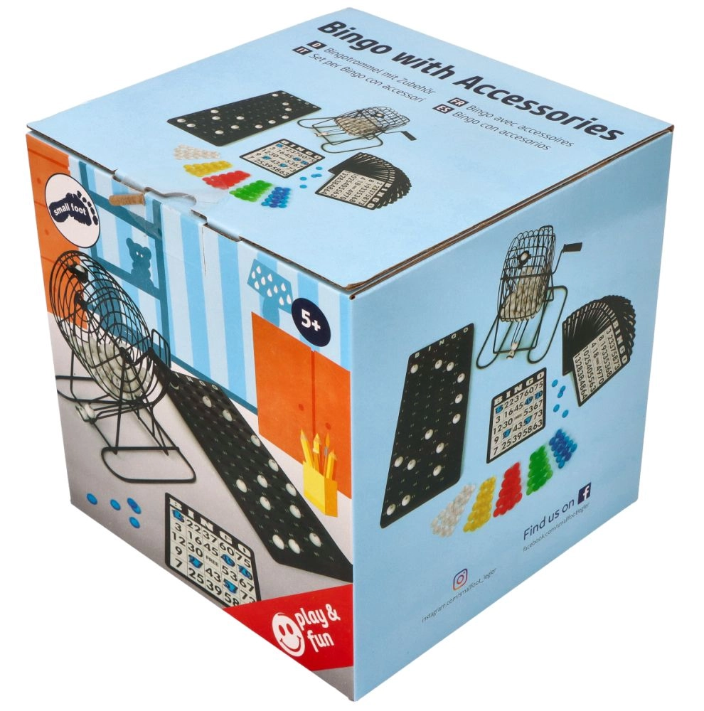 Απολαύστε την κλασική ομαδική διασκέδαση με το πλήρες σετ Bingo της Small Foot. Το σετ περιλαμβάνει μεταλλικό κλουβί κλήρωσης, χρωματιστά κουπόνια, λευκές αριθμημένες μπίλιες και πρακτικούς πλαστικούς δίσκους. Οι παίκτες διαλέγουν το χρώμα των κουπονιών τους, γυρίζουν τη μανιβέλα και παρακολουθούν ποια μπίλια πέφτει στη θήκη – κερδίζει όποιος σχηματίσει πρώτος τον σωστό συνδυασμό. Ένα υπέροχο παιχνίδι για παιδιά και ενήλικες, που αναπτύσσει την αναγνώριση αριθμών και προσφέρει αγωνία και χαρά από το κοινό παιχνίδι.