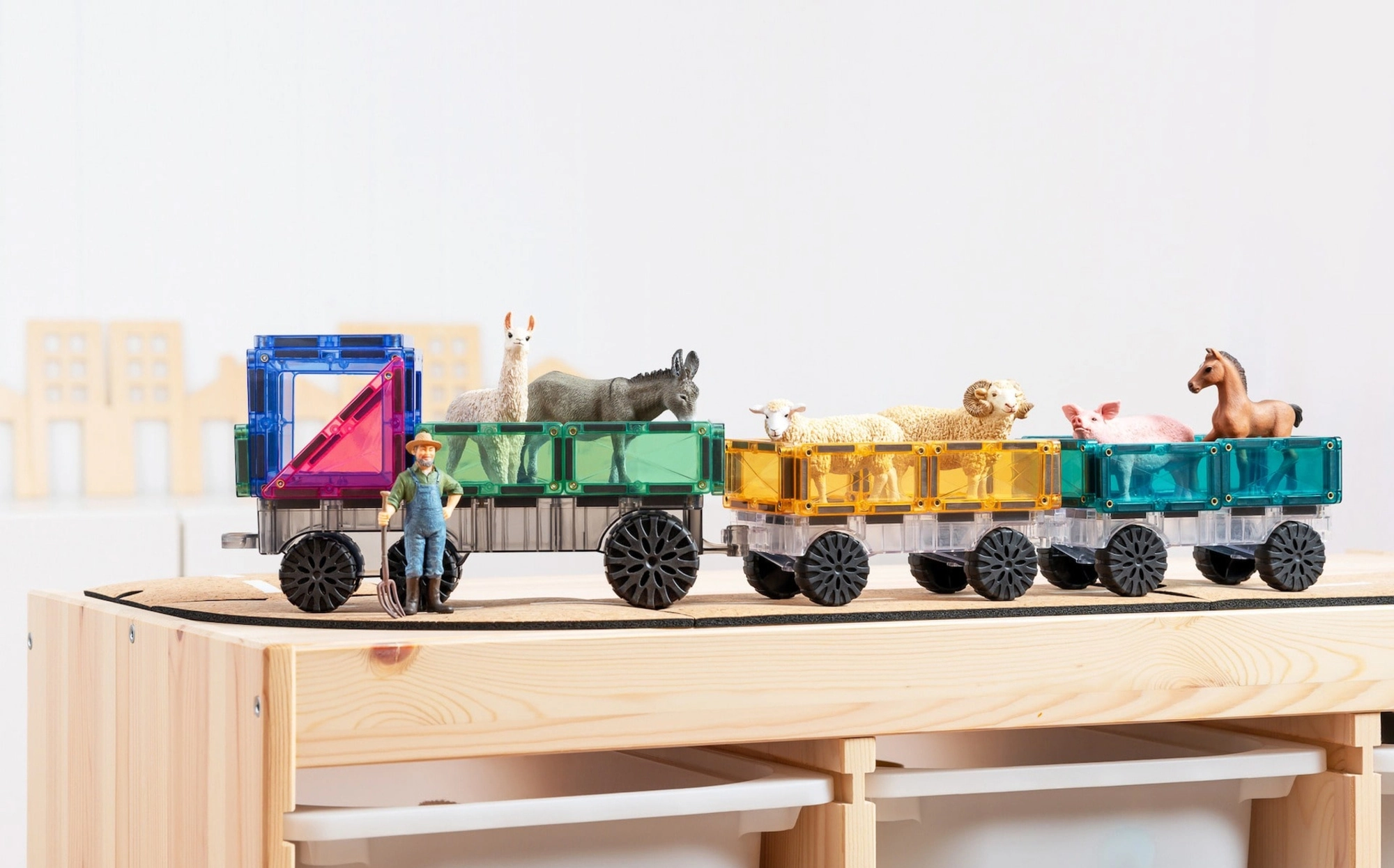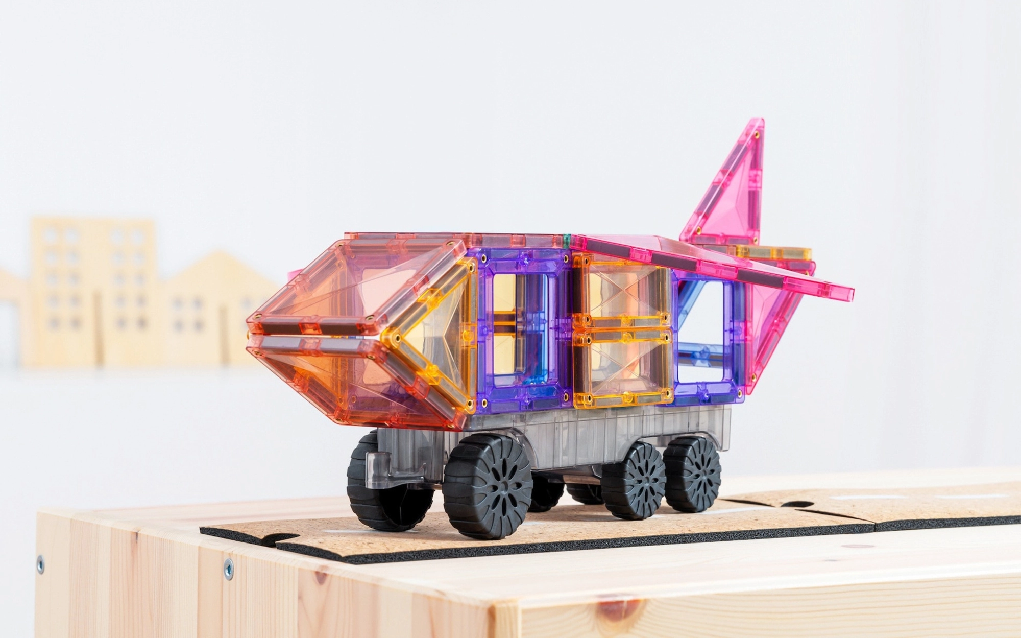 Τρία σασί με ρόδες μεταμορφώνουν το σετ σε αυτοκίνητα, τρένα ή πυραύλους. Τα παιδιά χτίζουν, ανακατασκευάζουν και εξερευνούν την κίνηση και τη σταθερότητα των δομών στην πράξη.