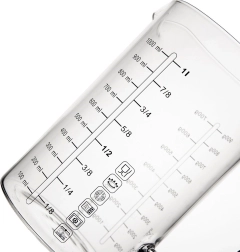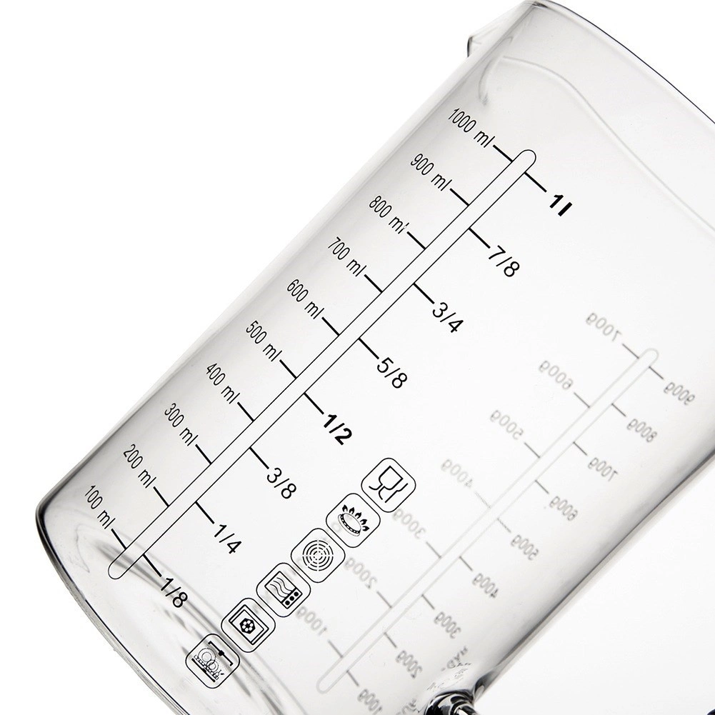 Οι κλίμακες είναι ευανάγνωστες και επιτρέπουν γρήγορη και αξιόπιστη μέτρηση. Θα βρείτε εδώ μέτρηση υγρών σε ml (100–1000 ml) και σε λίτρα (1/8 l – 1 l), καθώς και μετατροπές για αλεύρι (100–700 g) και ζάχαρη (100–900 g). Η μέγιστη σημειωμένη χωρητικότητα είναι 1 l, ενώ ο πραγματικός όγκος της κανάτας φτάνει έως 1,2 l.