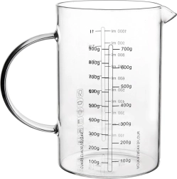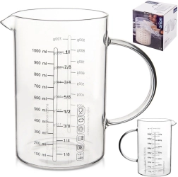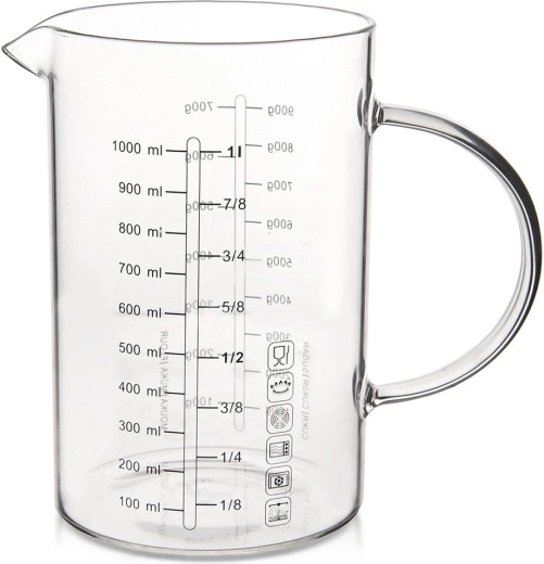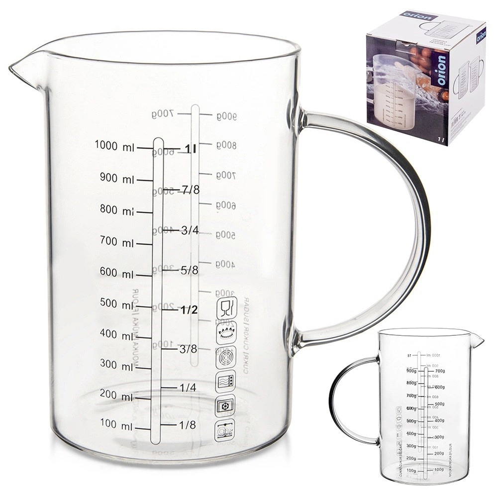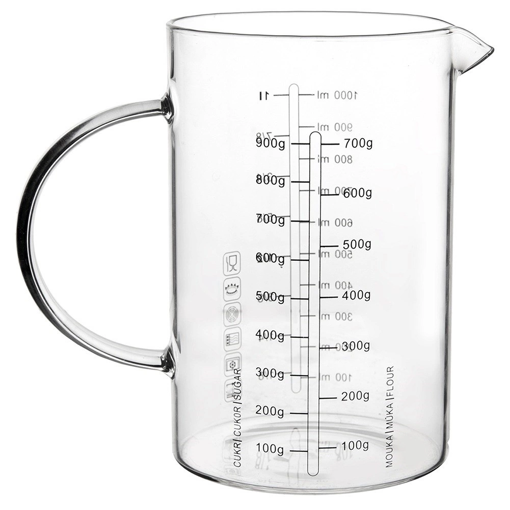 Το γυάλινο δοσομετρικό δοχείο σε μορφή κανάτας είναι απαραίτητος βοηθός για κάθε κουζίνα. Χάρη στο εργονομικό χερούλι και το πρακτικό στόμιο επιτρέπει ακριβές και καθαρό ράντισμα/μετάγγιση καθώς και ρίψη ξηρών υλικών. Κατασκευασμένο από ανθεκτικό βοριοπυριτικό γυαλί, αντέχει σε ευρύ φάσμα θερμοκρασιών και είναι κατάλληλο για καθημερινό μαγείρεμα και ψήσιμο.