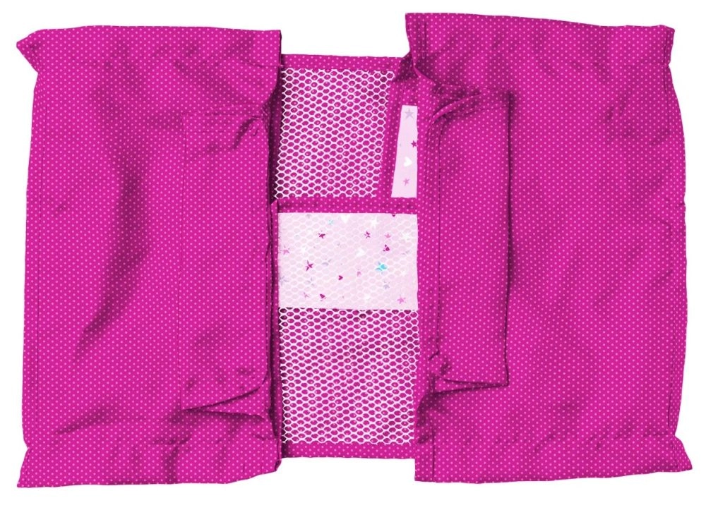 Το ροζ κρεβατάκι με μεταλλικό πλαίσιο είναι ιδανικό για παιχνίδι στο σπίτι και έξω. Είναι φορητό και ελαφρύ.