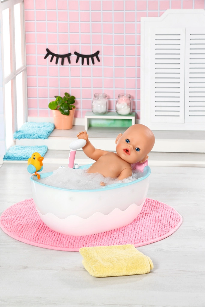 Προσφέρετε στην κούκλα σας χαλάρωση στη στιλάτη μπανιέρα BABY born σε λευκομπλέ σχεδιασμό με εικονικό κυματάκι. Τα παιδιά θα απολαύσουν αληθινό παιχνίδι με νερό χάρη στη λειτουργική κεφαλή ντους – όταν η μπανιέρα είναι γεμάτη, από το ντους ρέει πραγματικό νερό. Με το πάτημα του κουμπιού ανάβουν επίσης πολύχρωμα φωτεινά εφέ και ακούγονται αυθεντικοί ήχοι πιτσιλίσματος, που ενισχύουν την ατμόσφαιρα του μπάνιου.