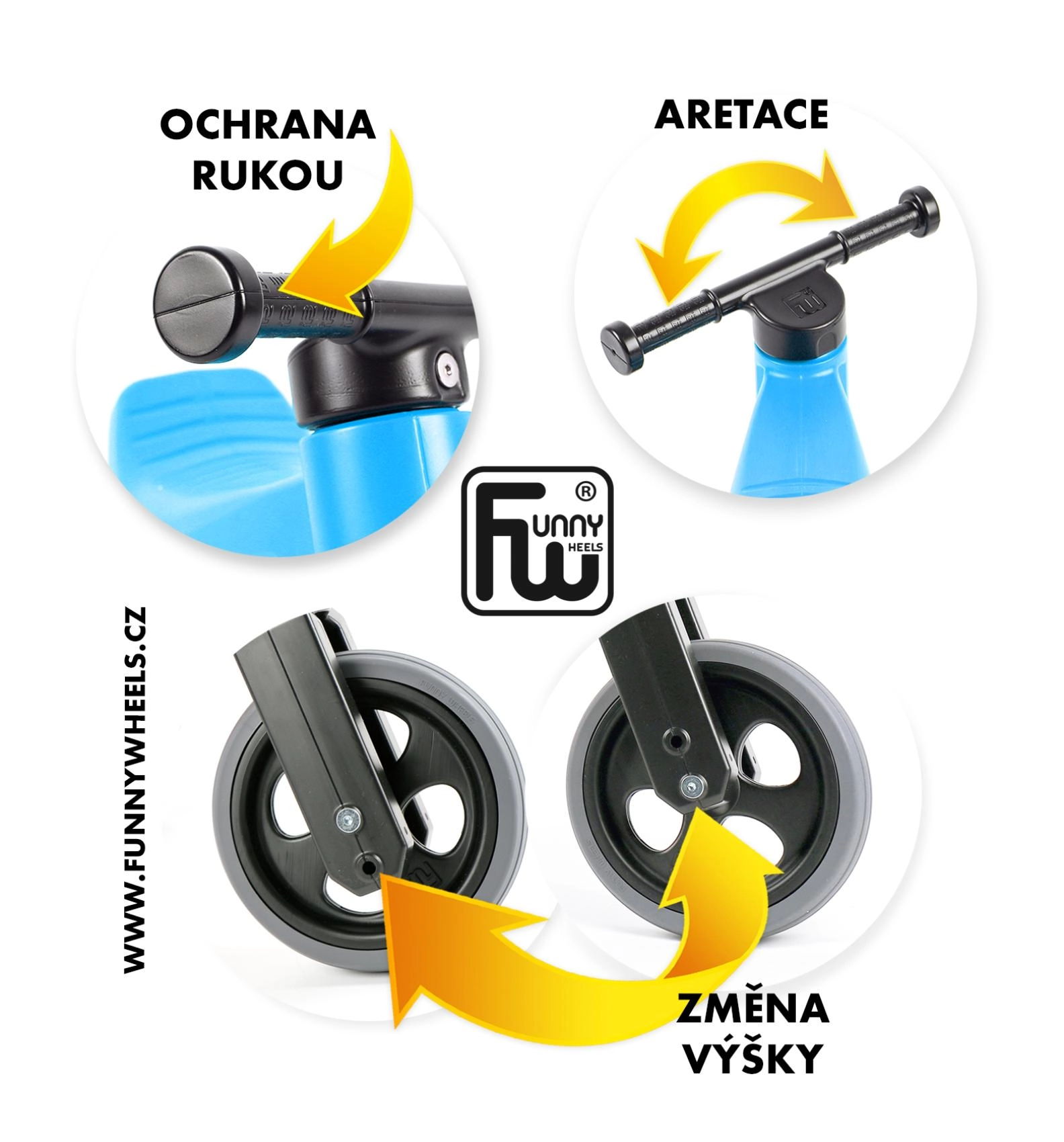 Ο περιορισμός περιστροφής του πιρουνιού αποτρέπει την υπερστροφή του τιμονιού, τα διευρυμένα άκρα προστατεύουν τα χέρια και το ανθεκτικό, αβλαβές πλαστικό έχει λείες ενώσεις.