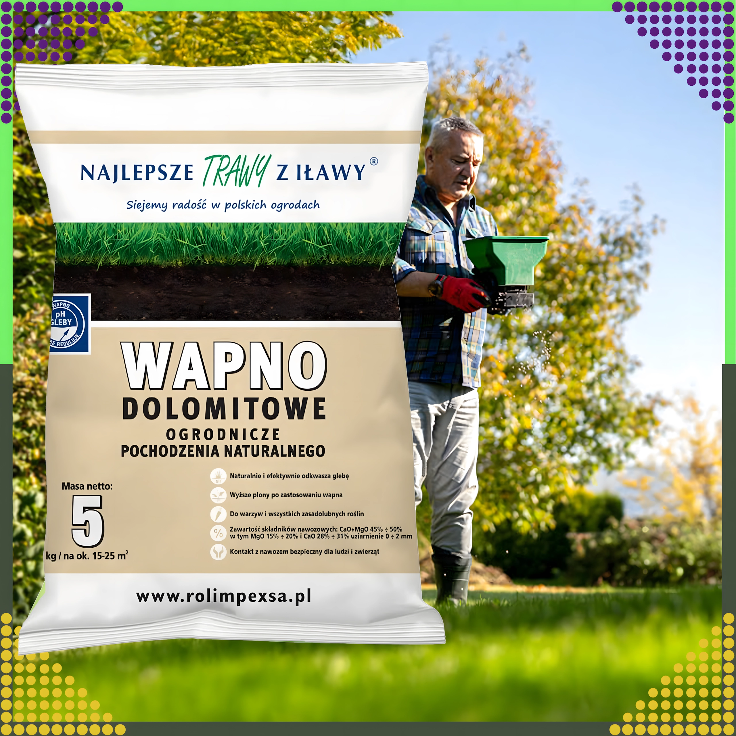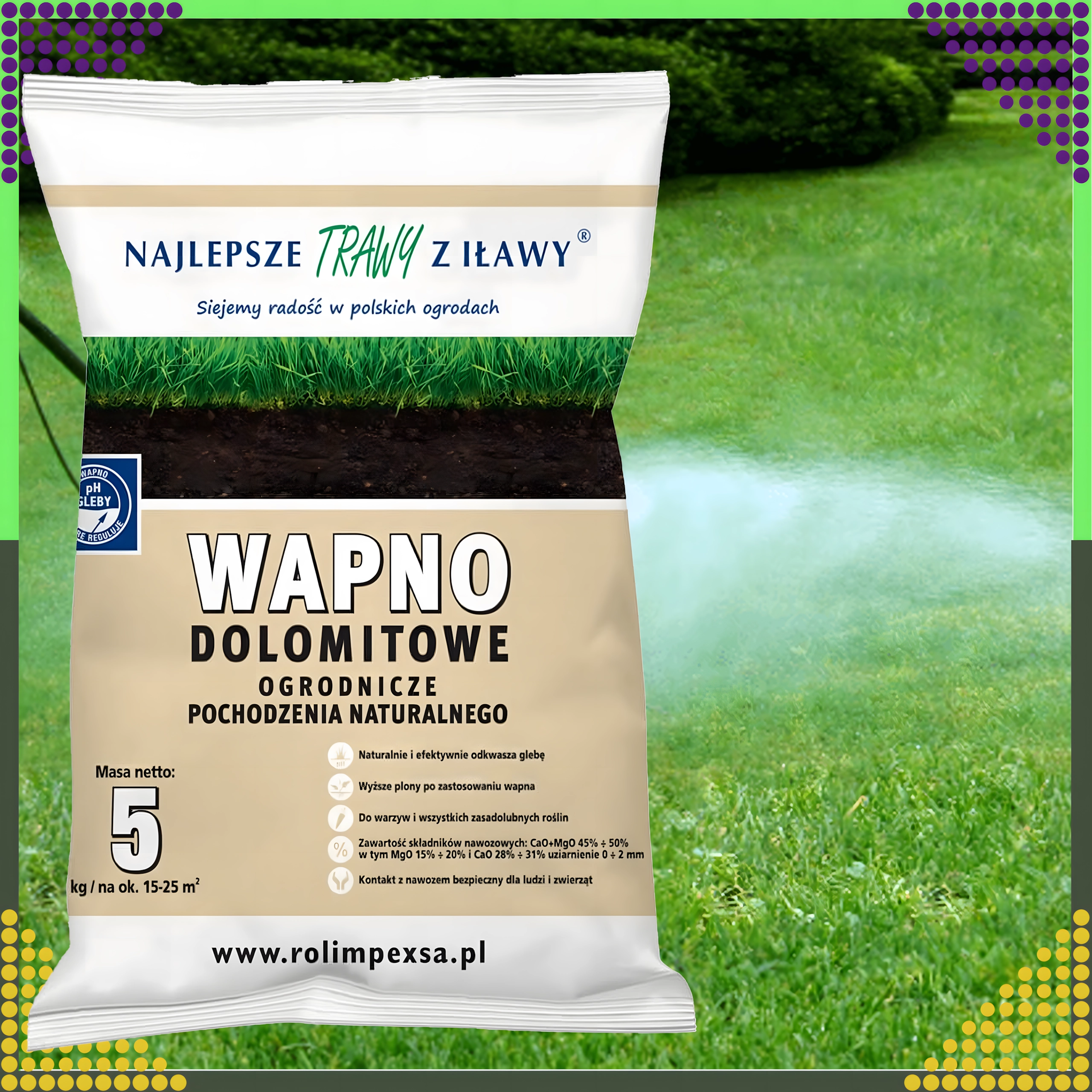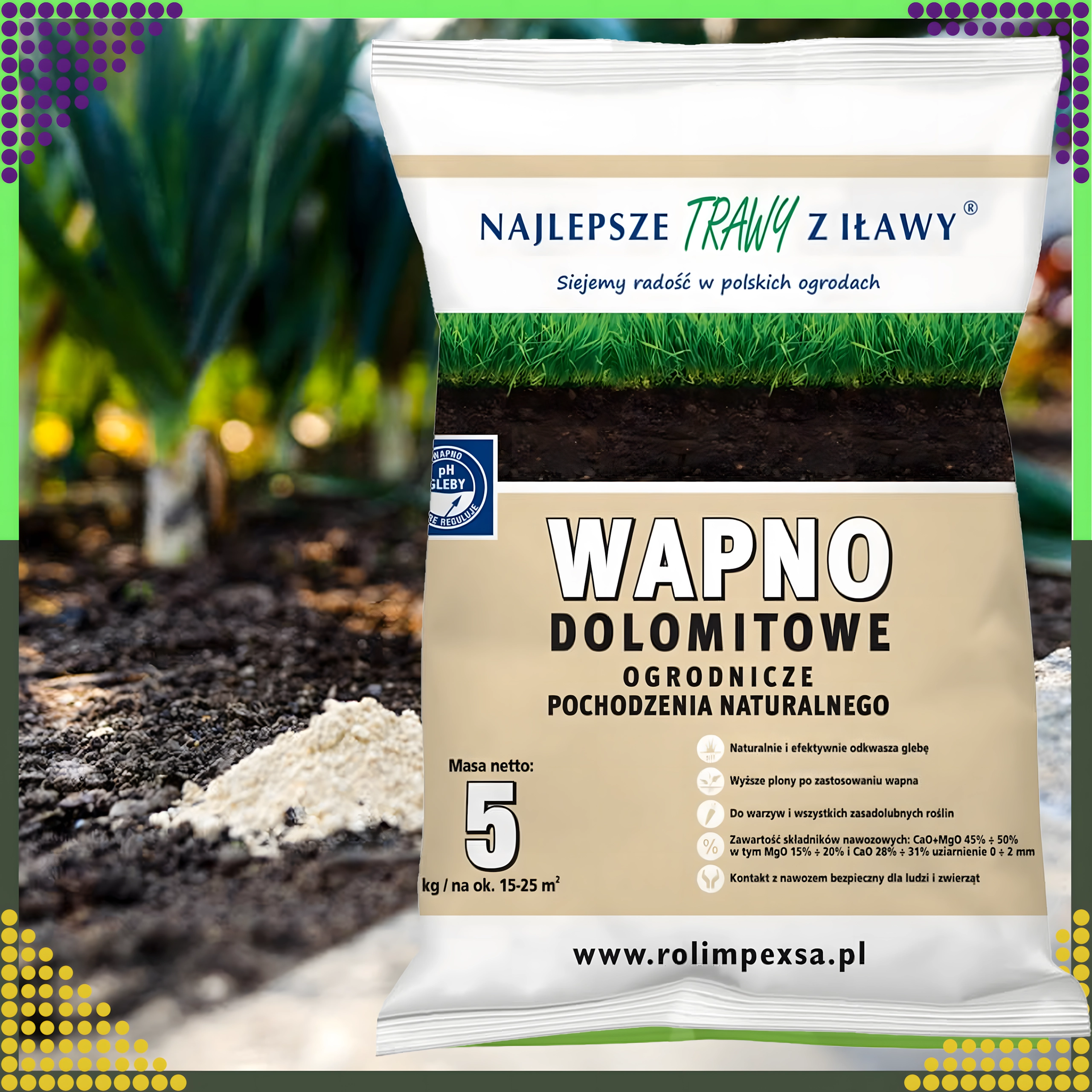 Ο δολομιτικός ασβέστης είναι φυσικό ορυκτό λίπασμα πλούσιο σε ασβέστιο και μαγνήσιο. Η τακτική εφαρμογή βοηθά στην εξισορρόπηση του pH, υποστηρίζει τον σχηματισμό χούμου και αυξάνει τη διαθεσιμότητα θρεπτικών για το ριζικό σύστημα. Κατάλληλο για καλλωπιστικές ζώνες, χλοοτάπητες, καθώς και για λαχανικά και οπωροφόρες φυτεύσεις.