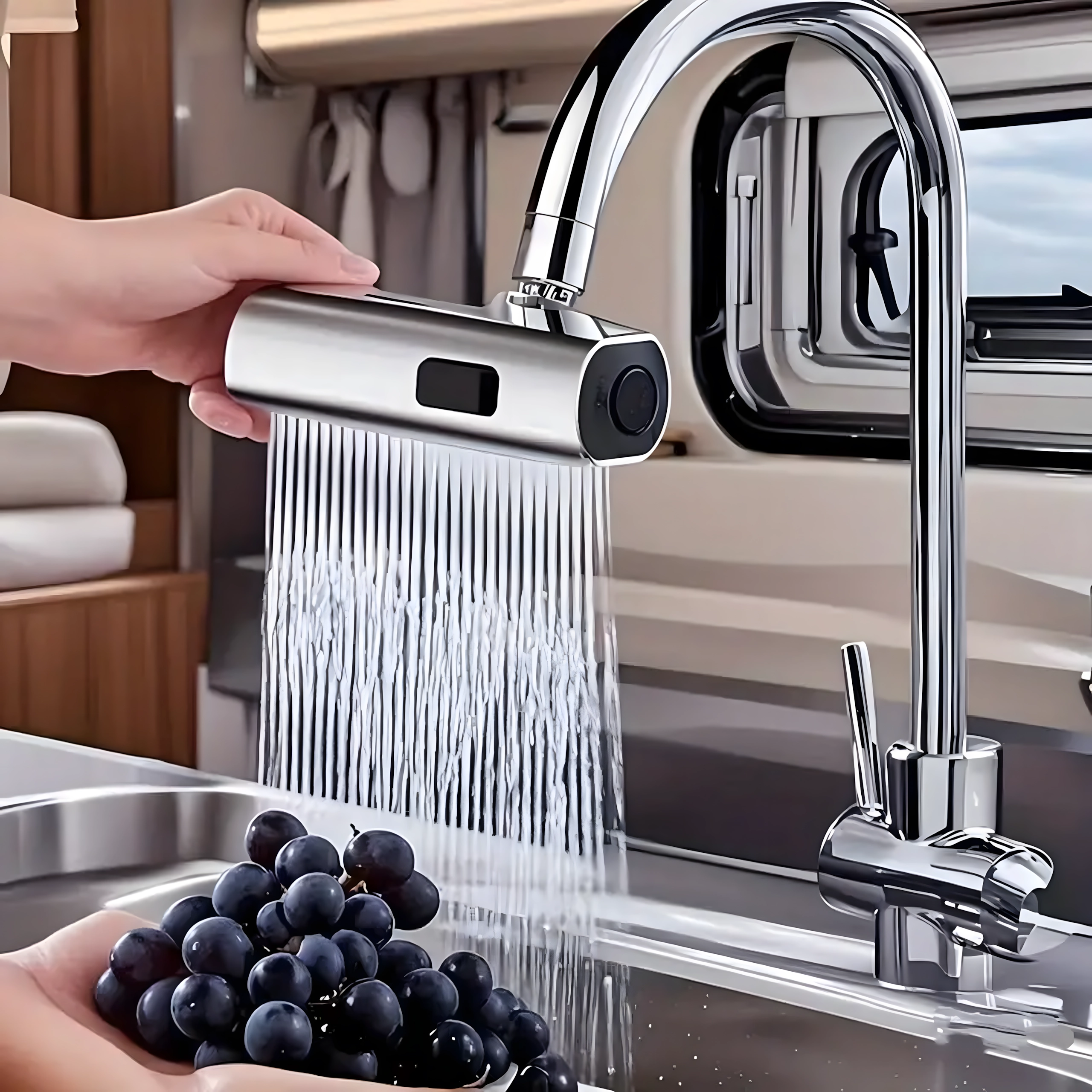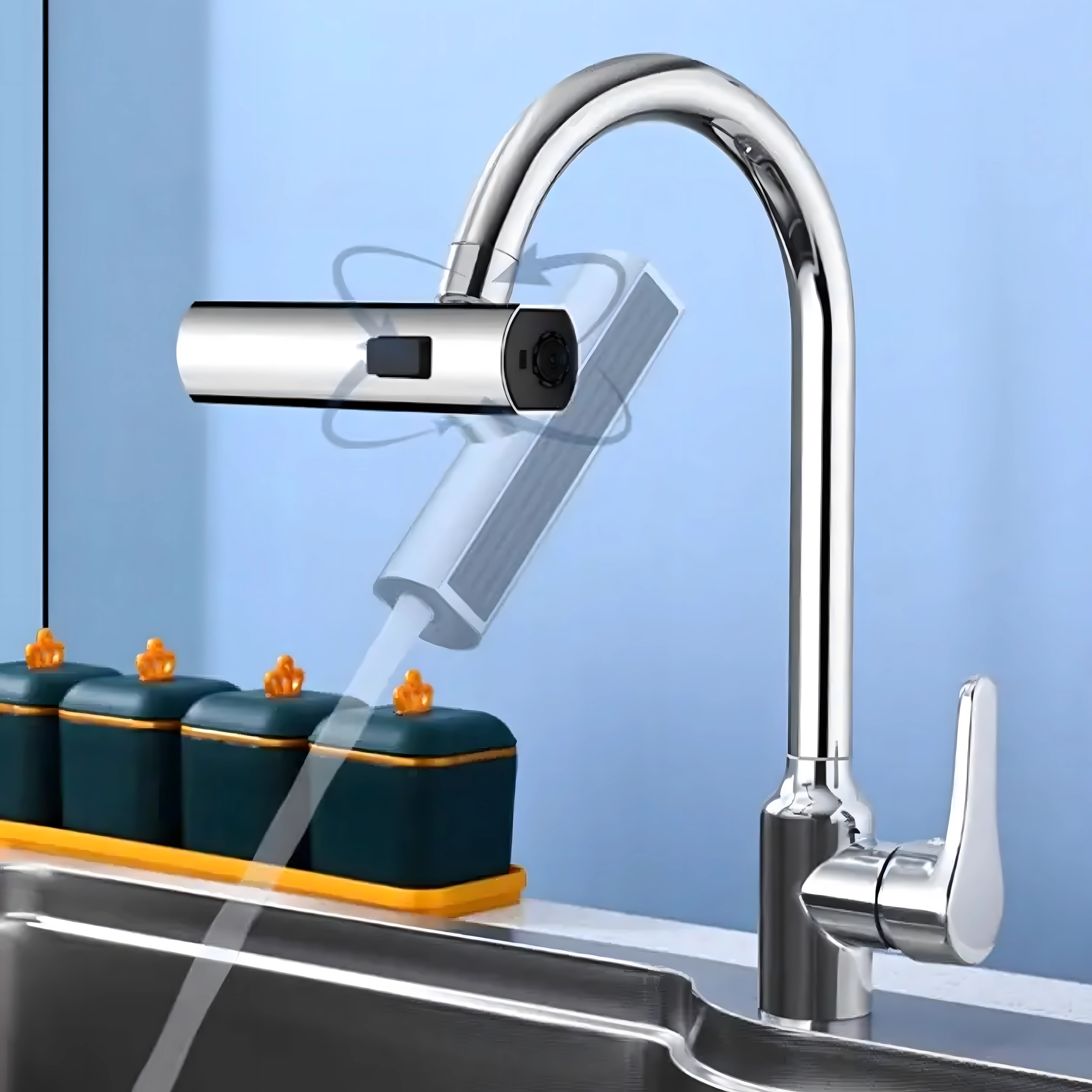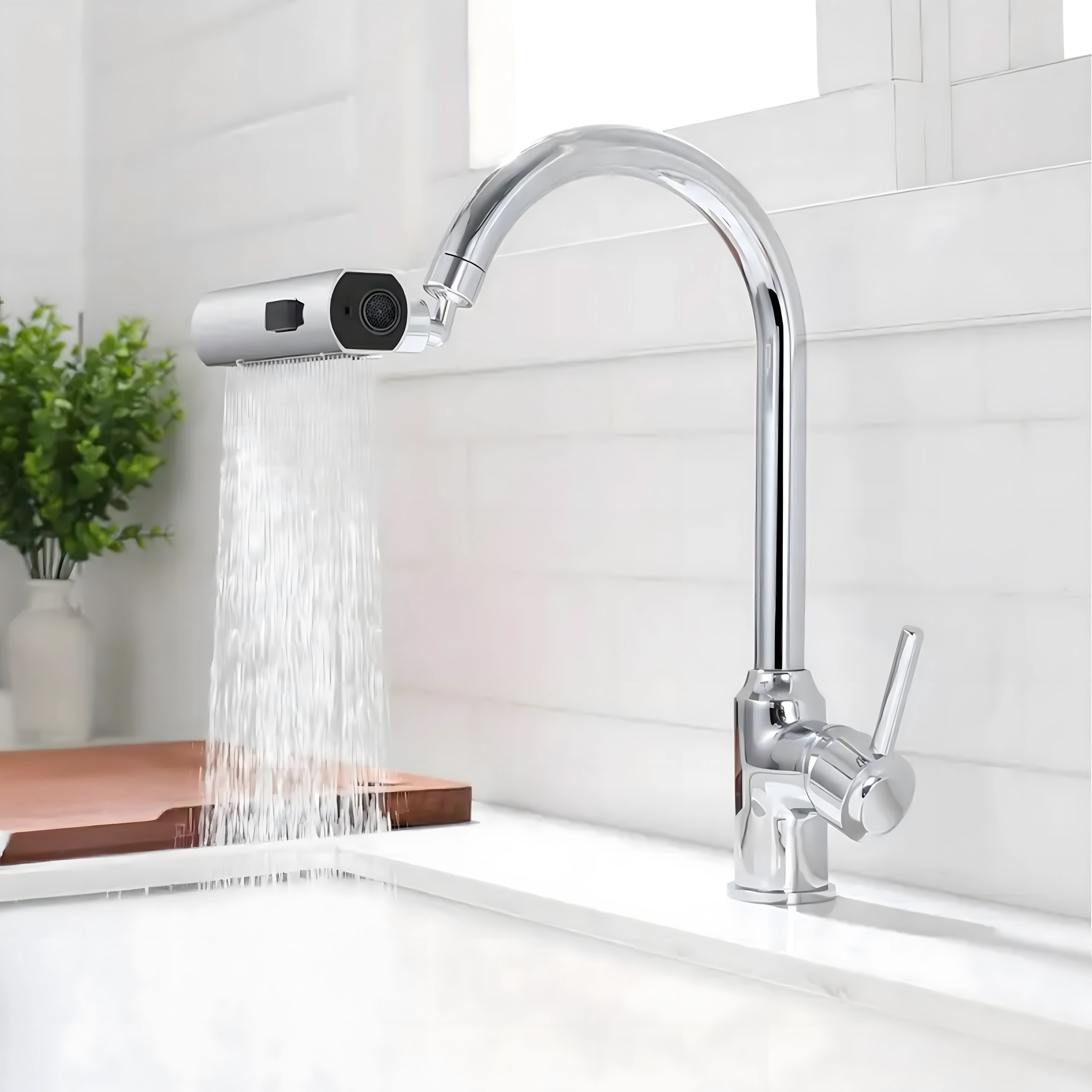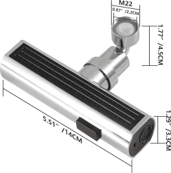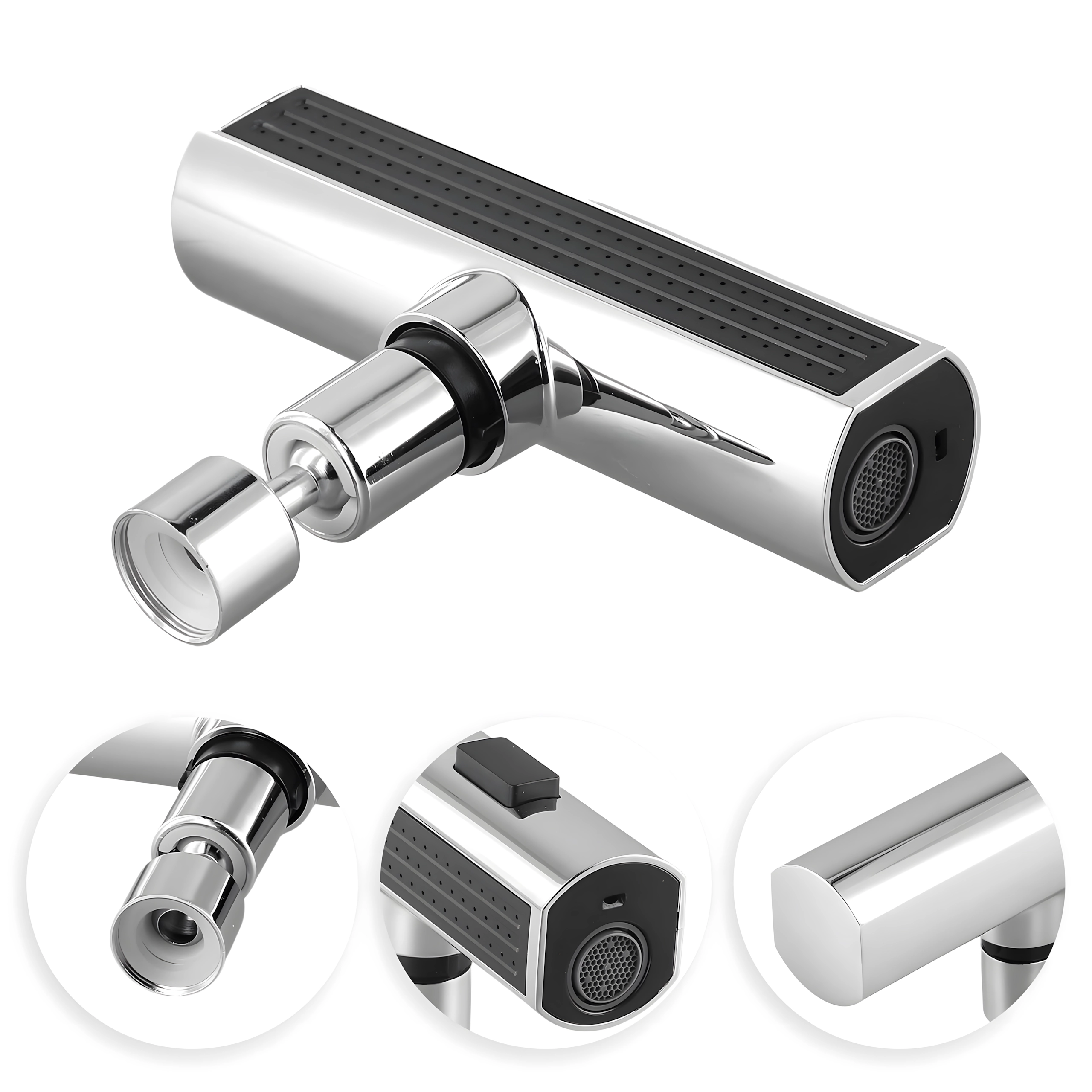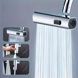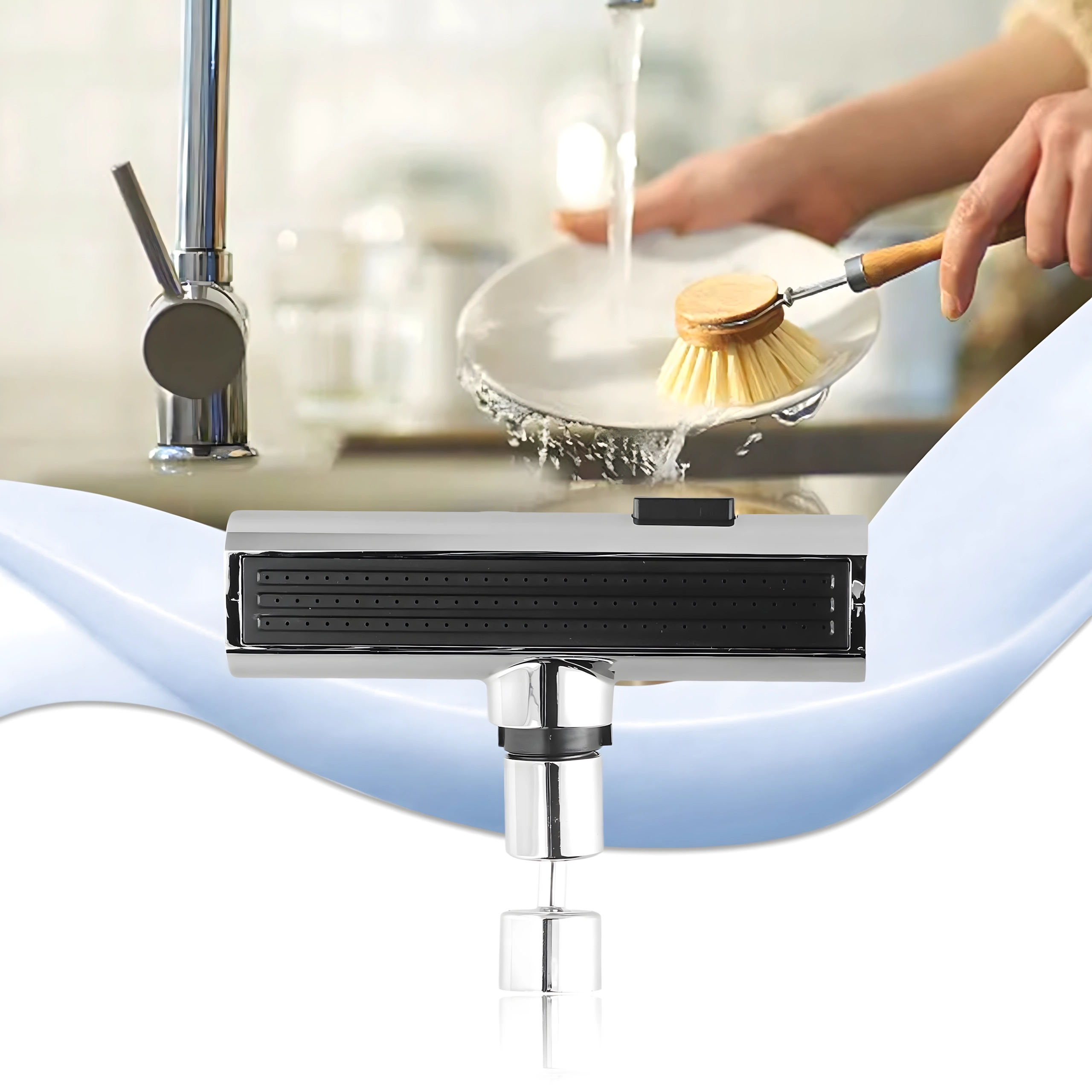 Πρακτικό εξάρτημα για τη βρύση κουζίνας που επιτρέπει άνετη αλλαγή της ροής νερού. Χάρη στο ενσωματωμένο περλατέρ για εξοικονόμηση νερού και τον καθολικό αντάπτορα για τις περισσότερες βρύσες, προσφέρει 3 λειτουργίες ροής: απαλή ομίχλη, ισχυρή ροή και ντους – ιδανικό για πλύσιμο πιάτων, ξέπλυμα λαχανικών και γρήγορο καθάρισμα νεροχύτη.