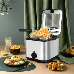 Συμπαγής φριτέζα λαδιού χωρητικότητας 2,5 l για οικιακό τηγάνισμα, προσφέρει γρήγορη και ομοιόμορφη προετοιμασία για τραγανές πατάτες, ψάρια και άλλες λιχουδιές. Χάρη στον ρυθμιζόμενο θερμοστάτη, το παραθυράκι επισκόπησης και την ισχύ 1000 W έχετε τον έλεγχο του τηγανίσματος και πετυχαίνετε εξαιρετικά αποτελέσματα με ελάχιστο κόπο.