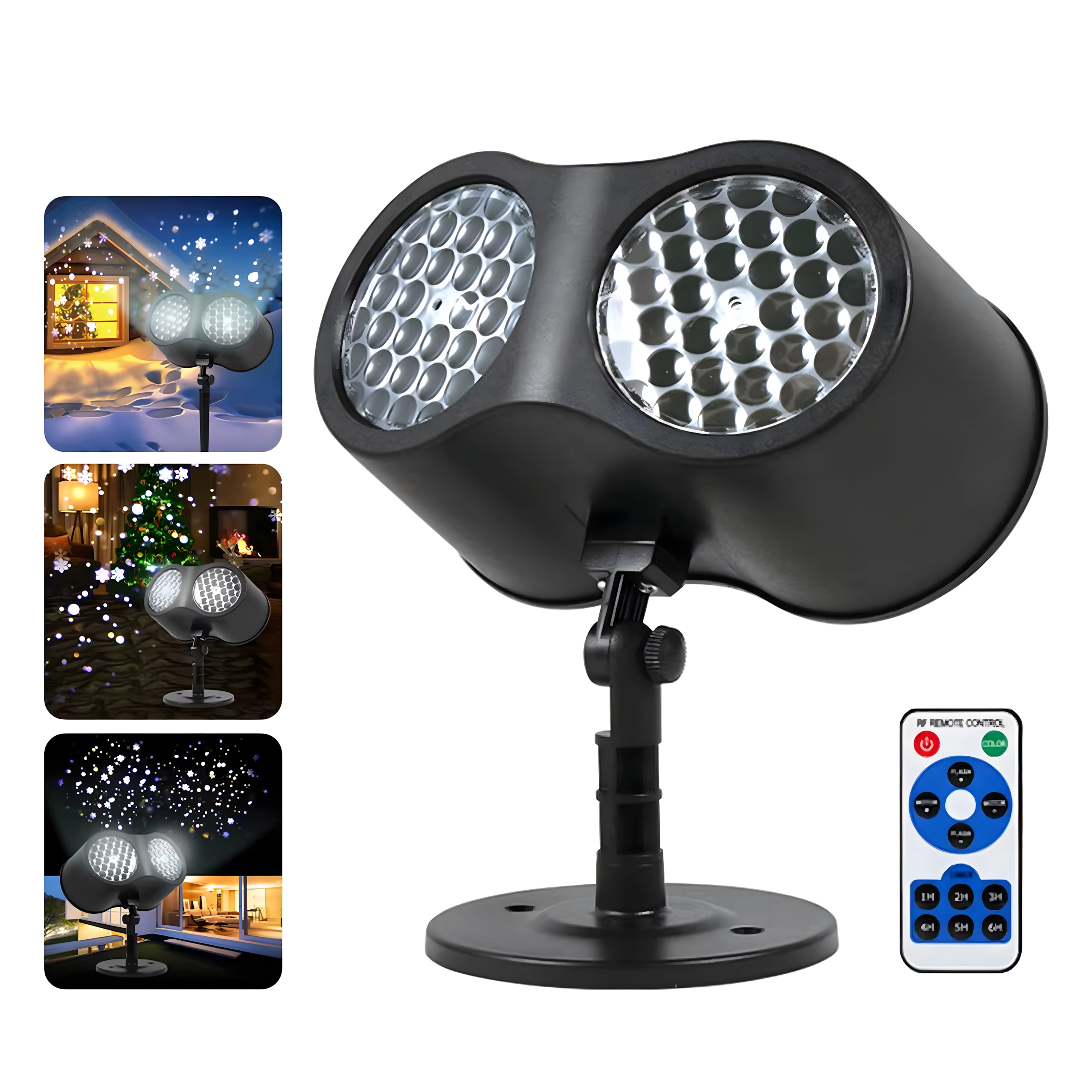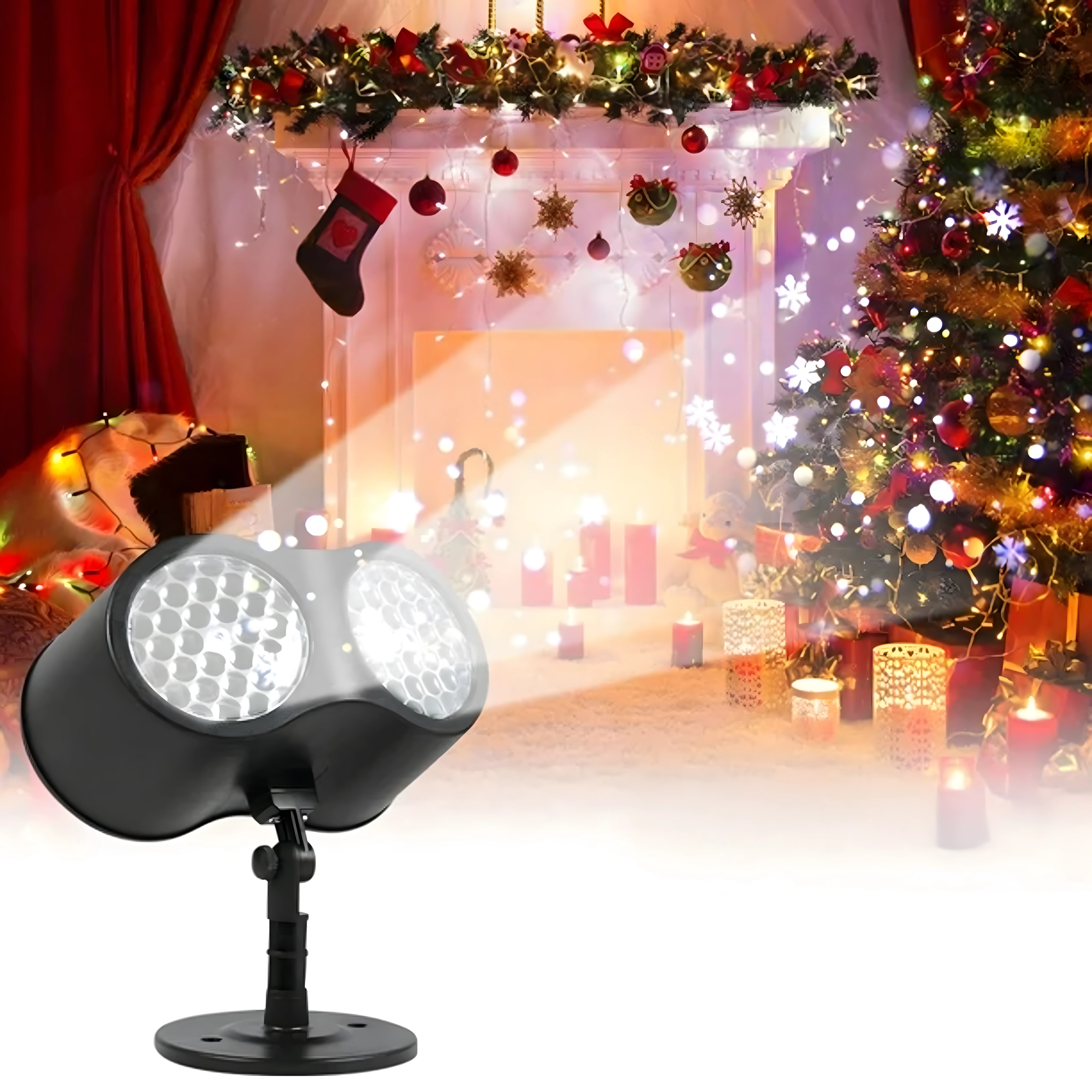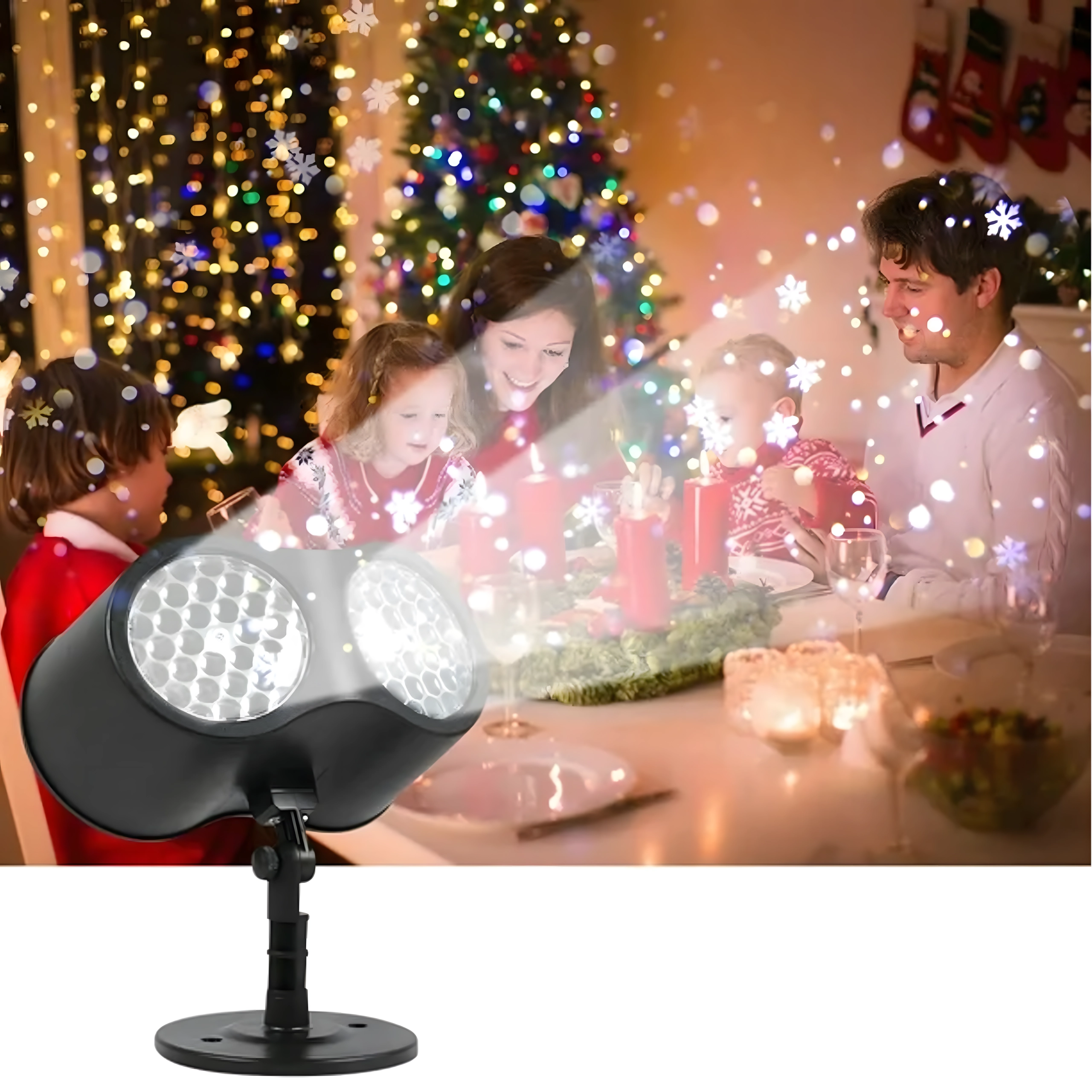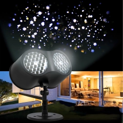 Η διπλή LED οπτική προβάλλει καθαρές, δυναμικές νιφάδες και κουκκίδες σε μεγάλες επιφάνειες τοίχων και προσόψεων – ιδανική για γρήγορο εορταστικό στολισμό χωρίς σκάλες και φωτεινές γιρλάντες.