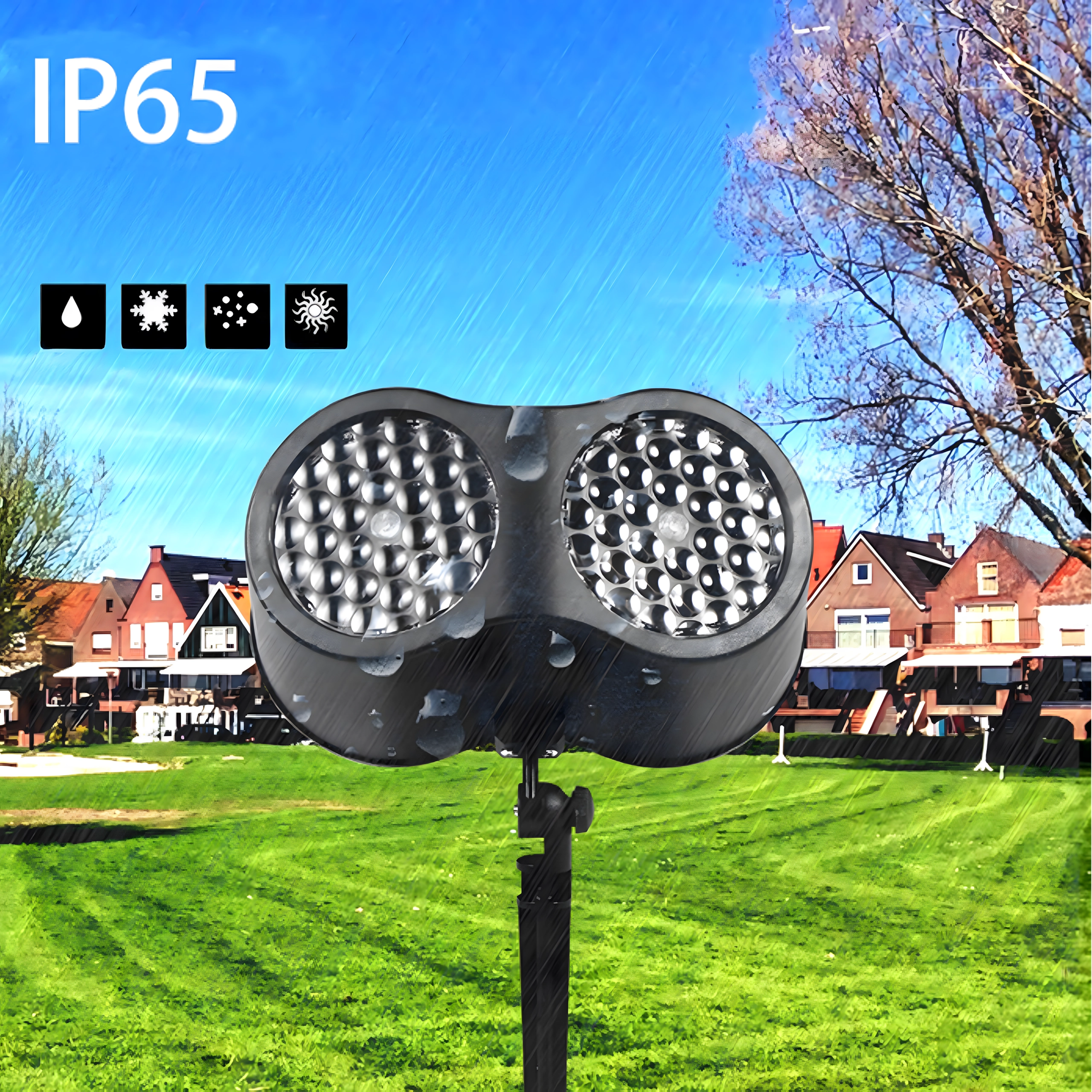 Η προστασία IP65 εξασφαλίζει αντοχή σε βροχή, χιόνι και παγετό. Έτσι μπορείτε να χρησιμοποιείτε τον προβολέα στον κήπο και στο σπίτι, απολαμβάνοντας τα εφέ σε κάθε καιρό.