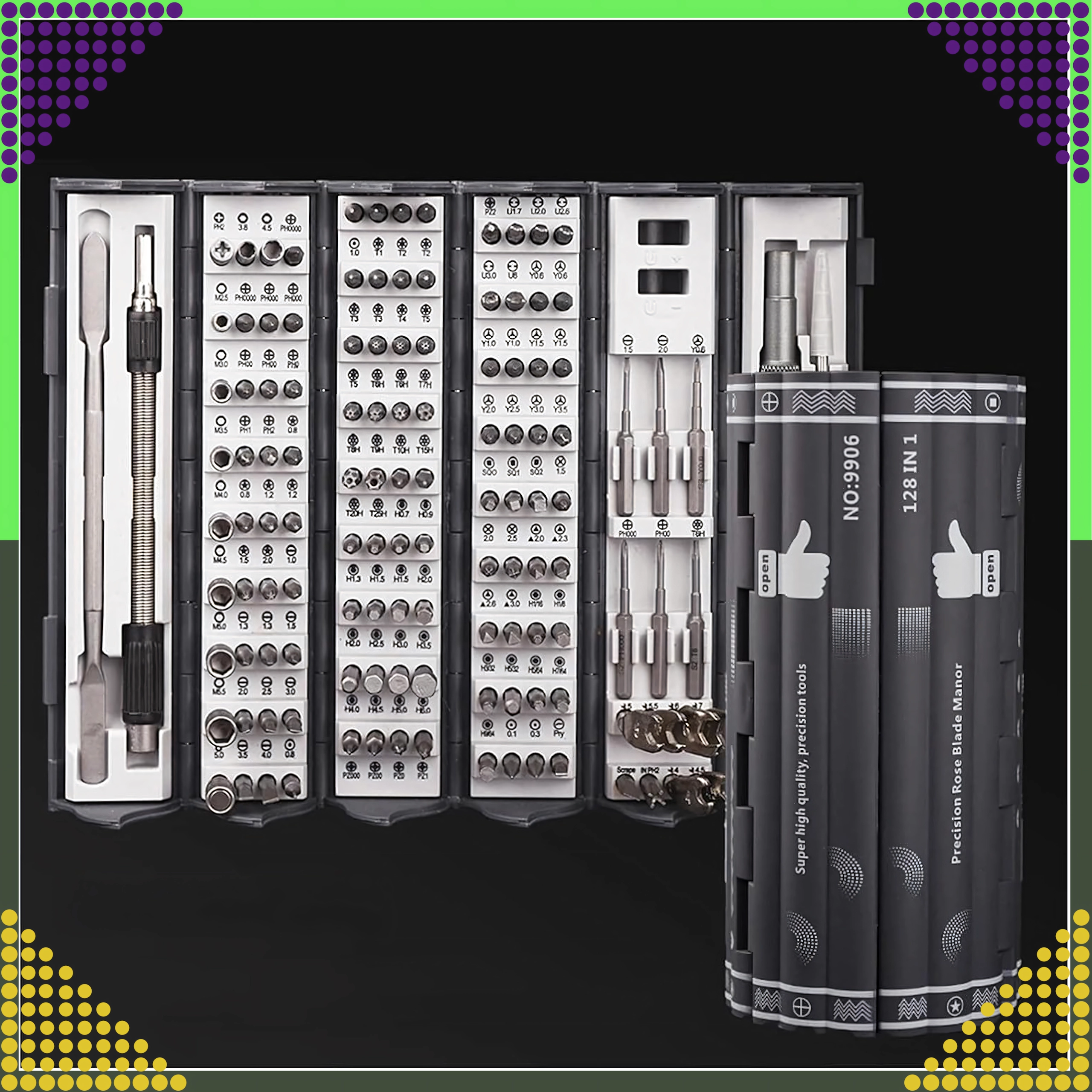 Ανακαλύψτε μέγιστη άνεση και ευελιξία με το σετ κατσαβιδιών και μπιτ 128 σε 1. Χάρη στις μαγνητικές άκρες, τις εργονομικές λαβές και την ευρεία γκάμα μπιτ, είναι ιδανικό για επισκευές ηλεκτρονικών, smartphones, φορητών υπολογιστών, γυαλιών αλλά και λεπτών μηχανικών συσκευών.