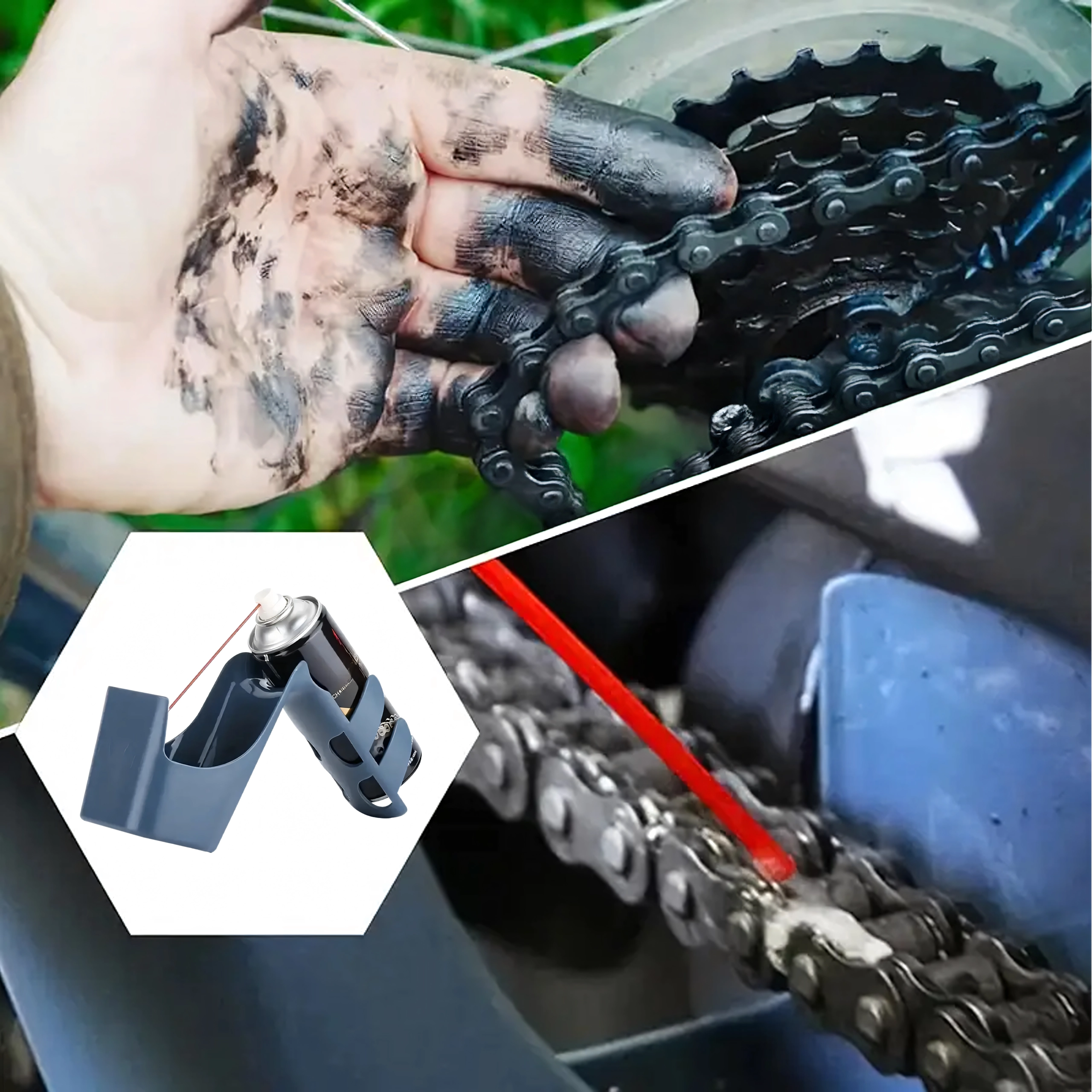 Η βάση στερεώνει με ασφάλεια το αεροζόλ και διευκολύνει την ακριβή εφαρμογή λιπαντικού ή καθαριστικού απευθείας στους κρίκους της αλυσίδας.