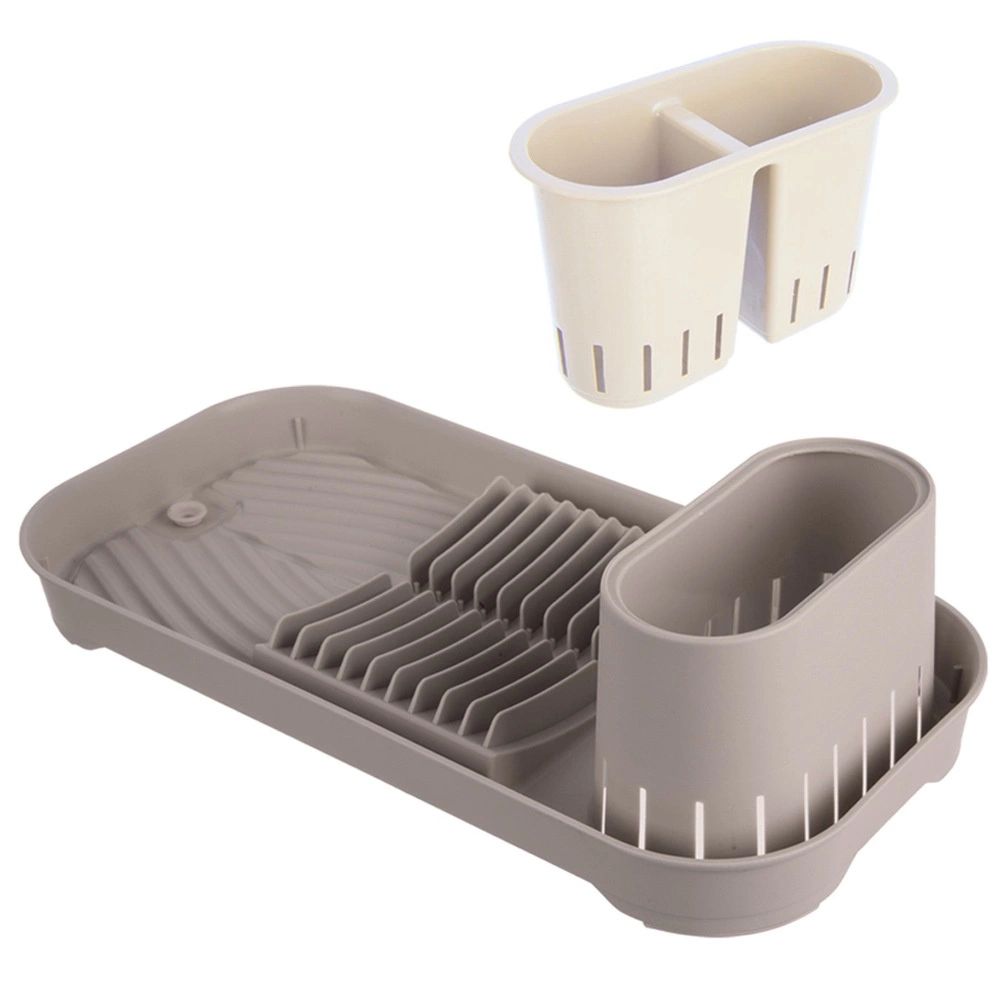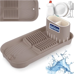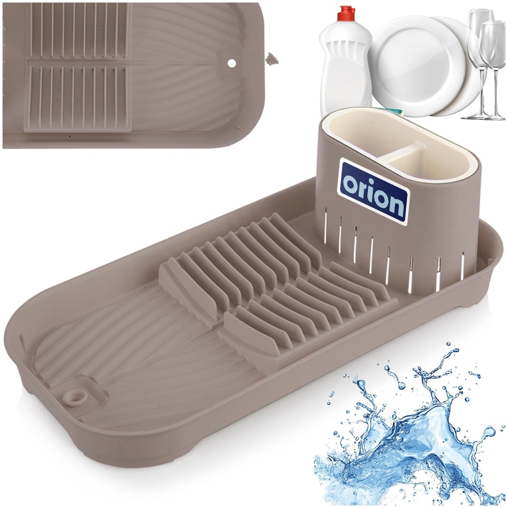 Πρακτικός και εξοικονόμησης χώρου στεγνωτήρας πιάτων που συνδυάζει κομψό καφέ‑εκρού φινίρισμα με λειτουργικό σχεδιασμό. Χάρη στη διπλή αποσπώμενη θήκη μαχαιροπίρουνων και τις εγκοπές για πιάτα, διατηρεί τάξη μετά το χειροκίνητο πλύσιμο. Ο πάτος με ενσωματωμένη αποστράγγιση και αυλακώσεις απομακρύνει το νερό κατευθείαν στον νεροχύτη, αφήνοντας τον πάγκο στεγνό.