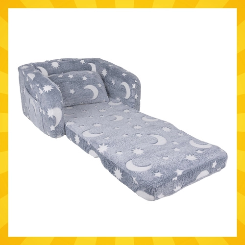 Απαλή άνεση και διασκέδαση σε ένα – η αναδιπλούμενη παιδική πολυθρόνα Kruzzel μετατρέπεται εύκολα σε σεζλόνγκ για διάβασμα, ξεκούραση και παραμύθια. Ελαφριά, ασφαλής και εύκολη στη μεταφορά, με πρακτική πλαϊνή τσέπη και απαλό βελουτέ κάλυμμα. Τα φθορίζοντα φεγγάρια και αστεράκια λάμπουν διακριτικά στο σκοτάδι δημιουργώντας ήρεμη ατμόσφαιρα για γαλήνιο ύπνο.