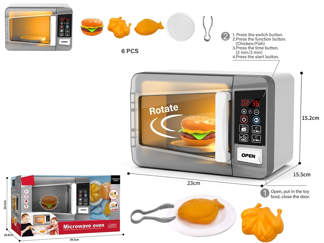 Αυτός ο παιδικός φούρνος μικροκυμάτων προσφέρει στα παιδιά μια αυθεντική εμπειρία μαγειρέματος. Με το πάτημα του κουμπιού START ανάβει το εσωτερικό, ξεκινά να γυρίζει ο δίσκος και ακούγονται ηχητικά εφέ που μιμούνται την πραγματική λειτουργία.