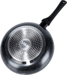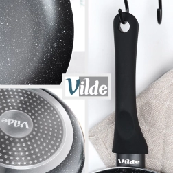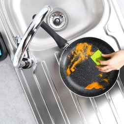Στιβαρός πάτος με ομοιόμορφη κατανομή θερμότητας, κατάλληλος για αέριο, ηλεκτρικό, κεραμικές, αλογόνου και επαγωγικές εστίες· τα τηγάνια πλένονται στο πλυντήριο πιάτων.