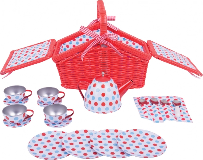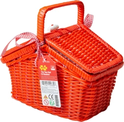 Γοητευτικό σετ τσαγιού σε κόκκινο ψάθινο καλάθι που φέρνει χαρά στο παιχνίδι. Περιλαμβάνει τέσσερα φλιτζάνια, πιατάκια, τσαγιέρα με κουταλάκια, ιδανικό για παιδικά τσαϊά στο σπίτι και στις εκδρομές.