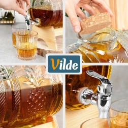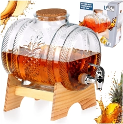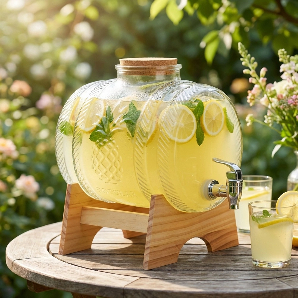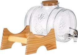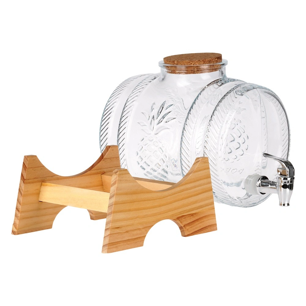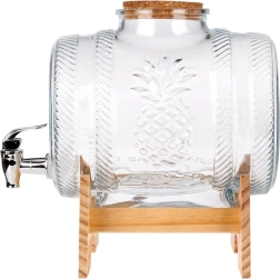 Αυτός ο κομψός διανεμητής ποτών συνδυάζει ποιοτικό, χοντρό γυαλί με διακοσμητικό ανάγλυφο ανανά, μεταλλικό βρυσάκι για ομαλό σερβίρισμα και ξύλινη βάση για σταθερότητα και άνεση. Με χωρητικότητα 5 λίτρων είναι τέλειος για πάρτι στον κήπο, οικογενειακές γιορτές και στιλάτα μπουφέ. Το φελλό καπάκι κρατά το ποτό φρέσκο και χωρίς έντομα.