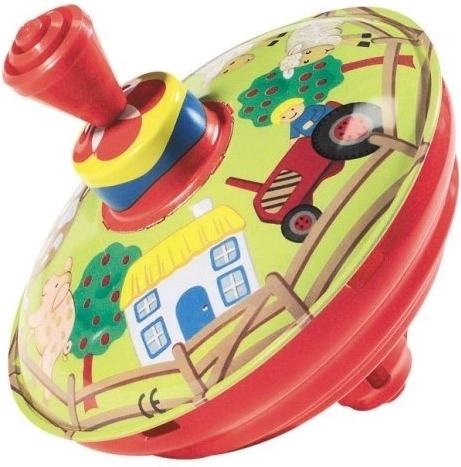 Αυτή η παραδοσιακή μουσική σβούρα με μοτίβο αγροτικής αυλής είναι ιδανικό παιχνίδι για τα μικρότερα παιδιά. Ο απλός μηχανισμός πίεσης του μοχλού θέτει τη σβούρα σε κίνηση, προσφέροντας τον χαρακτηριστικό ήχο και οπτικά ερεθίσματα κατά την περιστροφή.