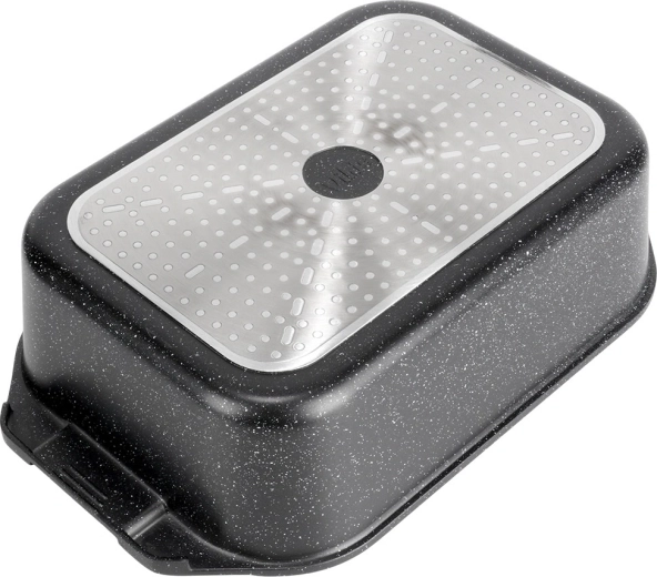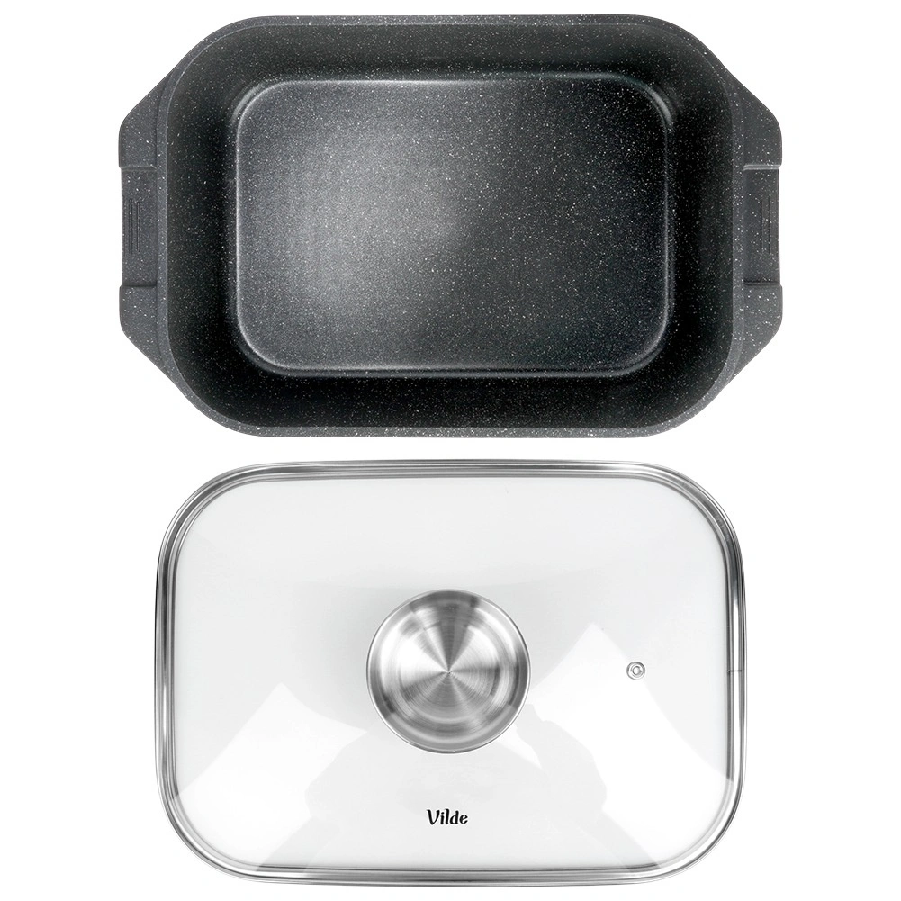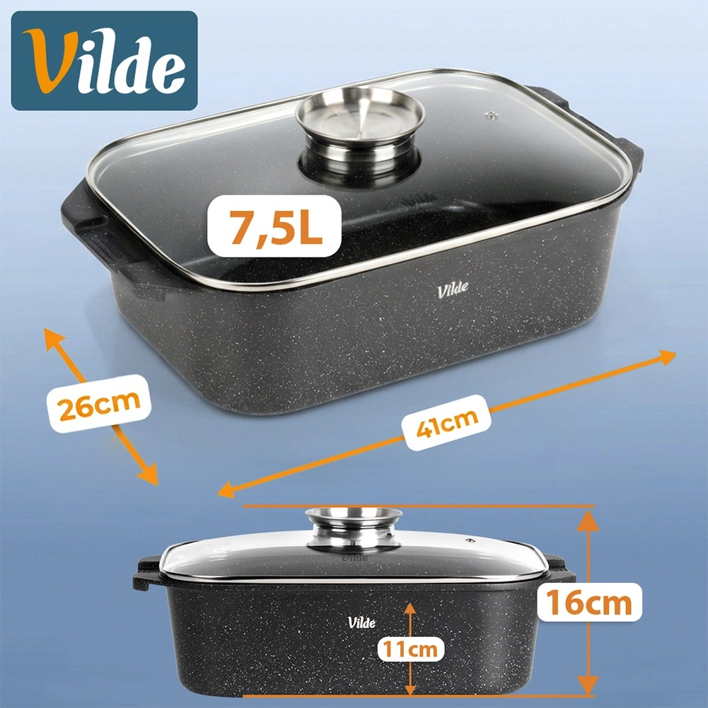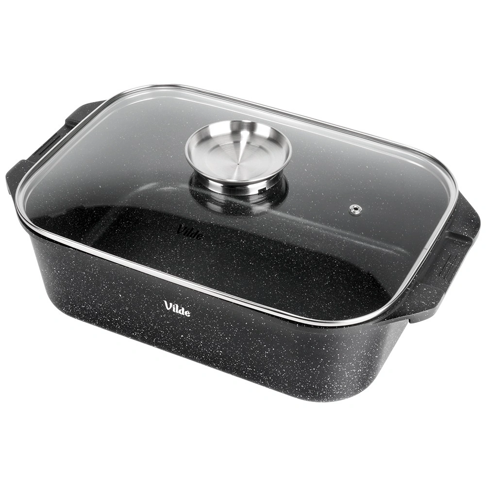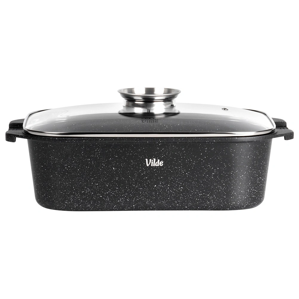 Πολυχρηστική γάστρα διαστάσεων 41 × 26 × 16 cm (ύψος σκεύους χωρίς καπάκι 11 cm), αξιόπιστος βοηθός για το καθημερινό μαγείρεμα. Το στιβαρό χυτό αλουμίνιο με αντικολλητική γρανιτένια στρώση εξασφαλίζει ομοιόμορφη κατανομή θερμότητας και εύκολη απελευθέρωση των φαγητών. Το γυάλινο καπάκι είναι θερμοανθεκτικό και επιτρέπει άνετο έλεγχο της προετοιμασίας.