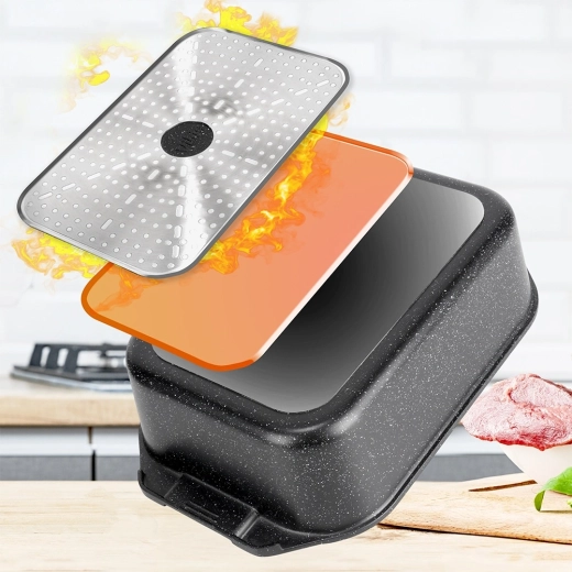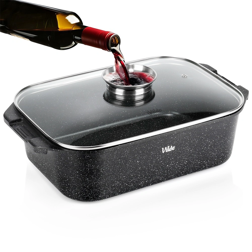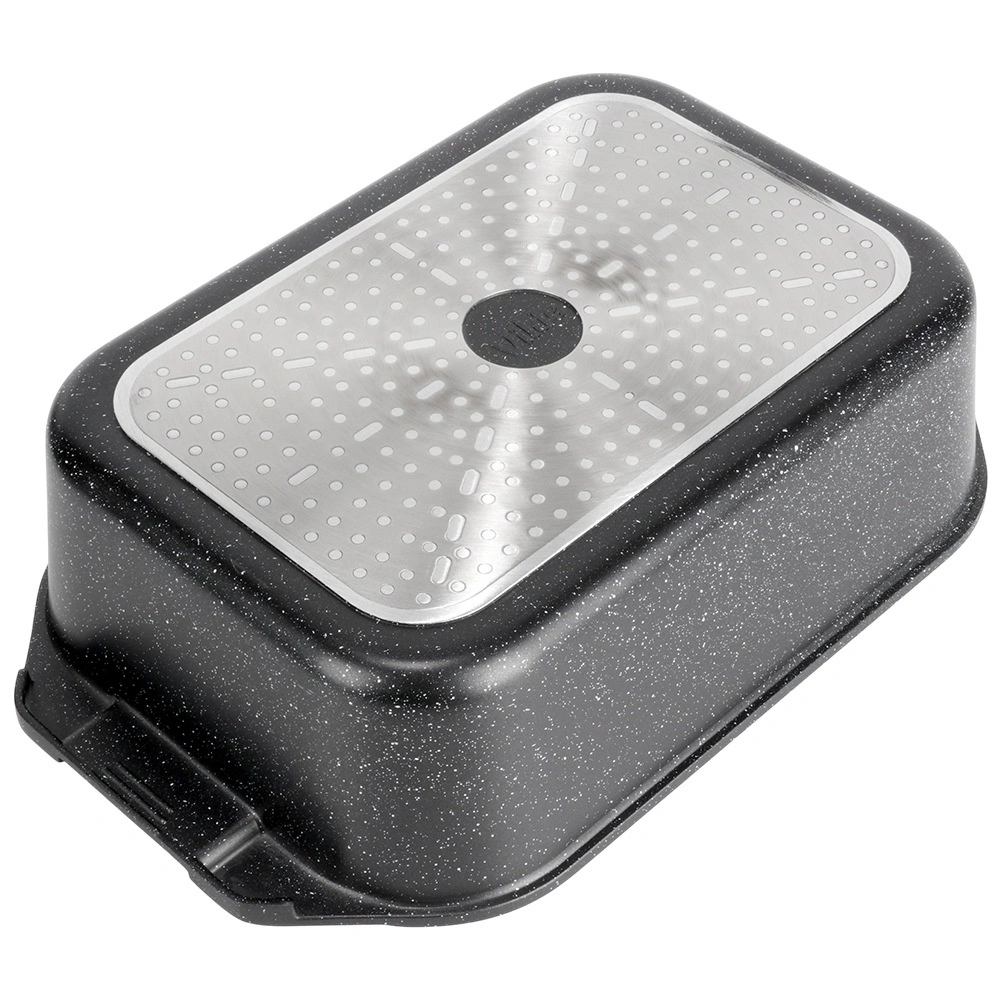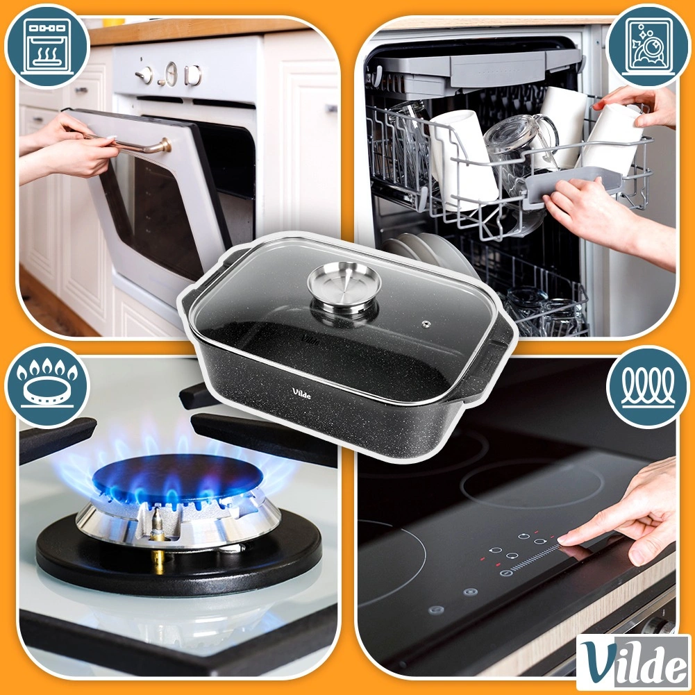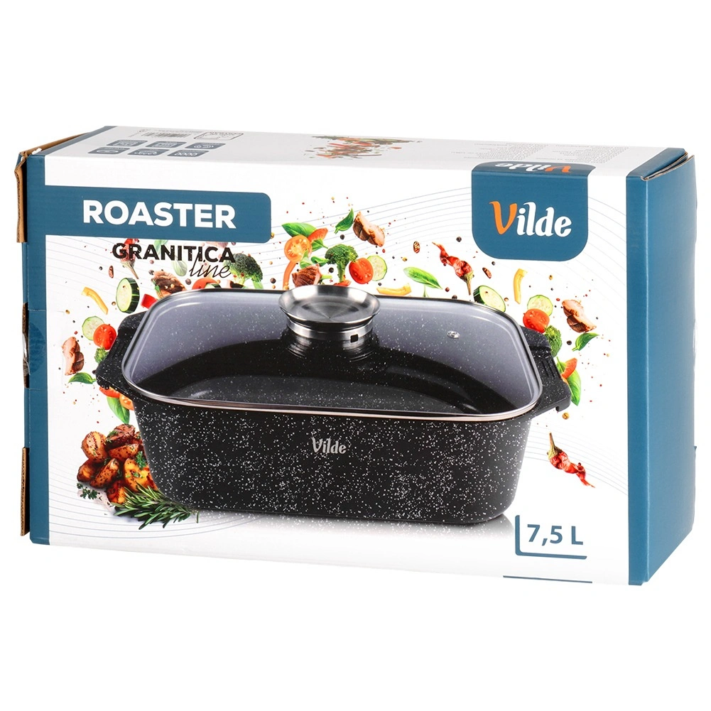Πολυχρηστική γάστρα διαστάσεων 41 × 26 × 16 cm (ύψος σκεύους χωρίς καπάκι 11 cm), αξιόπιστος βοηθός για το καθημερινό μαγείρεμα. Το στιβαρό χυτό αλουμίνιο με αντικολλητική γρανιτένια στρώση εξασφαλίζει ομοιόμορφη κατανομή θερμότητας και εύκολη απελευθέρωση των φαγητών. Το γυάλινο καπάκι είναι θερμοανθεκτικό και επιτρέπει άνετο έλεγχο της προετοιμασίας.