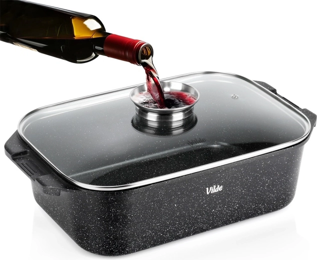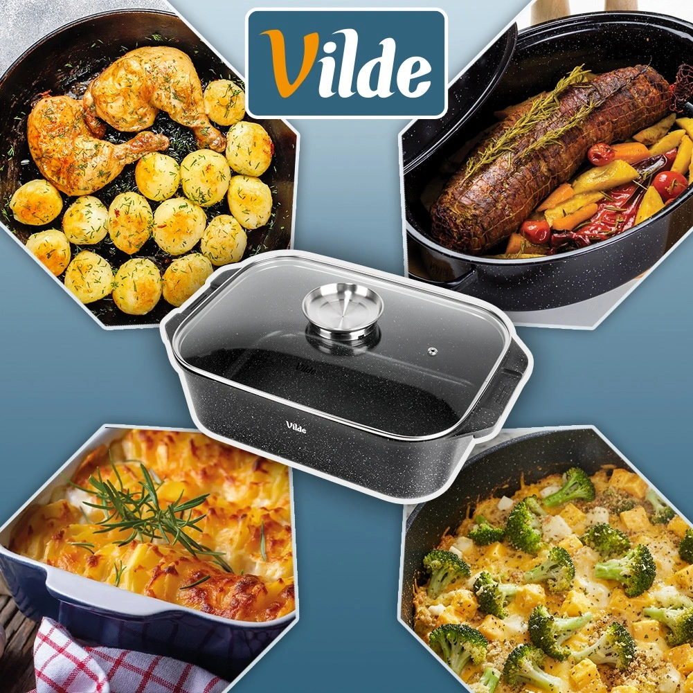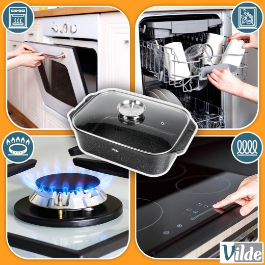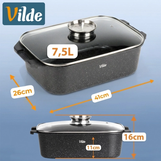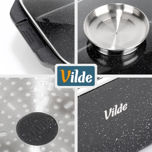 Εύκολη συντήρηση και μεγάλη αντοχή: η ποιοτική επιφάνεια μειώνει το κάψιμο και όλο το σετ μπορεί να πλυθεί στο πλυντήριο πιάτων. Αυθεντικό προϊόν της VILDE από τη σειρά GRANITICA LINE που κατασκευάζεται σύμφωνα με ευρωπαϊκά πρότυπα.