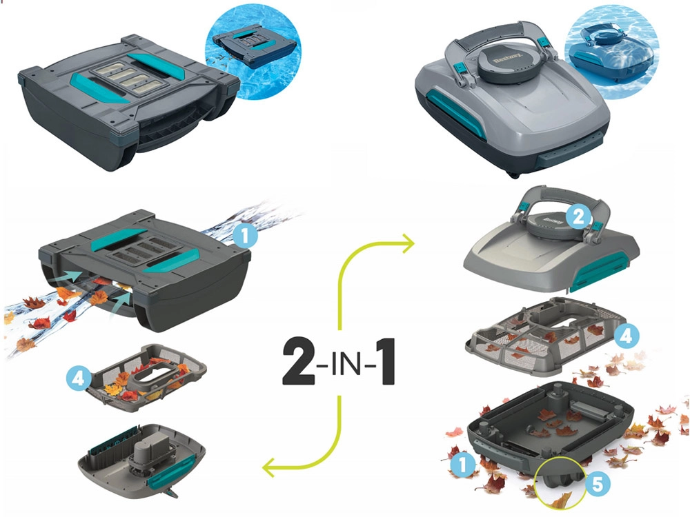 Οι έξυπνοι υδάτινοι αισθητήρες ενεργοποιούν το ρομπότ μετά την εμβάπτιση και το απενεργοποιούν όταν αφαιρεθεί από το νερό, προστατεύοντας έτσι τον κινητήρα. Γρήγορη φόρτιση 3–4 ώρες και ασύρματη κατασκευή προσφέρουν απόλυτη ελευθερία κίνησης. Τα μεγάλα καλάθια συγκρατούν φύλλα, άμμο και έντομα και καθαρίζονται εύκολα με το άνω προσβάσιμο φίλτρο.