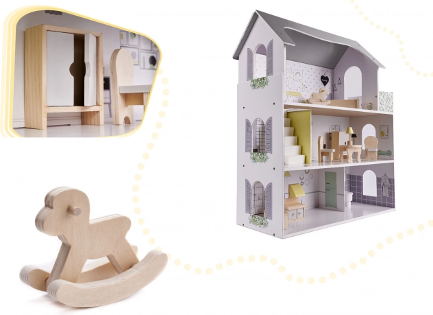 Ανακαλύψτε τη μαγεία του ξύλινου σπιτιού για κούκλες, που θα γίνει το επίκεντρο κάθε παιδικού παιχνιδιού. Το σπίτι έχει τρία επίπεδα και είναι εξοπλισμένο με κομψά ξύλινα έπιπλα, που χαρίζουν σε κάθε δωμάτιο μοναδική εμφάνιση. Επιλέξτε ανάμεσα σε κήπο, κουζίνα, κρεβατοκάμαρα και σαλόνι, που έχουν σχεδιαστεί ιδανικά για παιχνίδι με κούκλες.