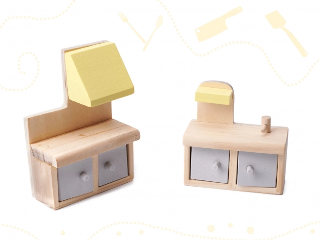 Μικρή ξύλινη κουζίνα με ρεαλιστικές λεπτομέρειες, ιδανικό μέρος για την προετοιμασία φανταστικών γευμάτων και διασκέδαση των παιδιών σας.