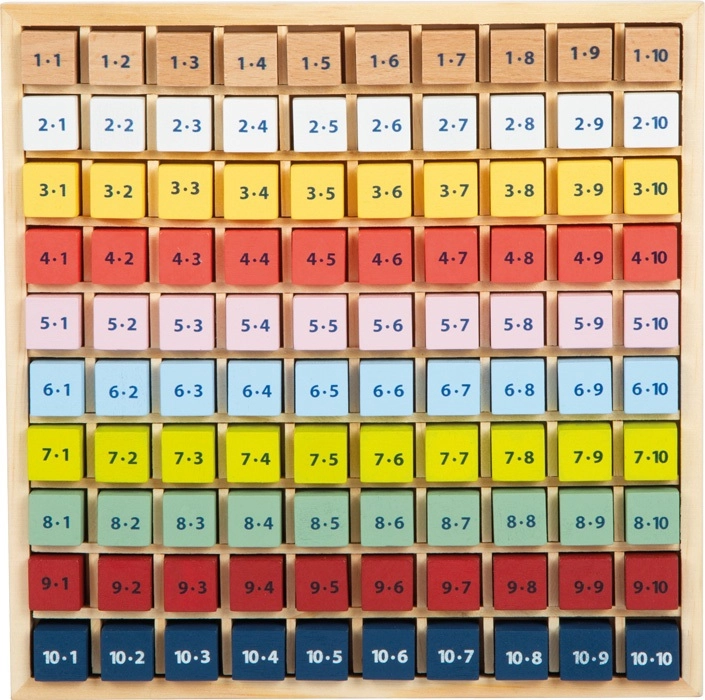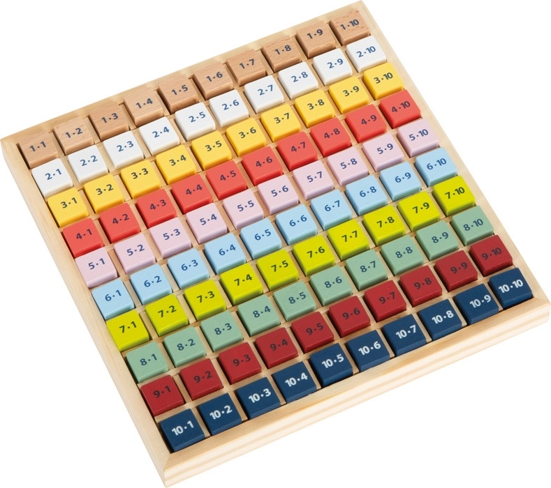 Πολύχρωμα ξύλινα τουβλάκια με παραδείγματα παρακινούν τα παιδιά να ανακαλύπτουν και να επαναλαμβάνουν την προπαίδεια κάθε μέρα.
