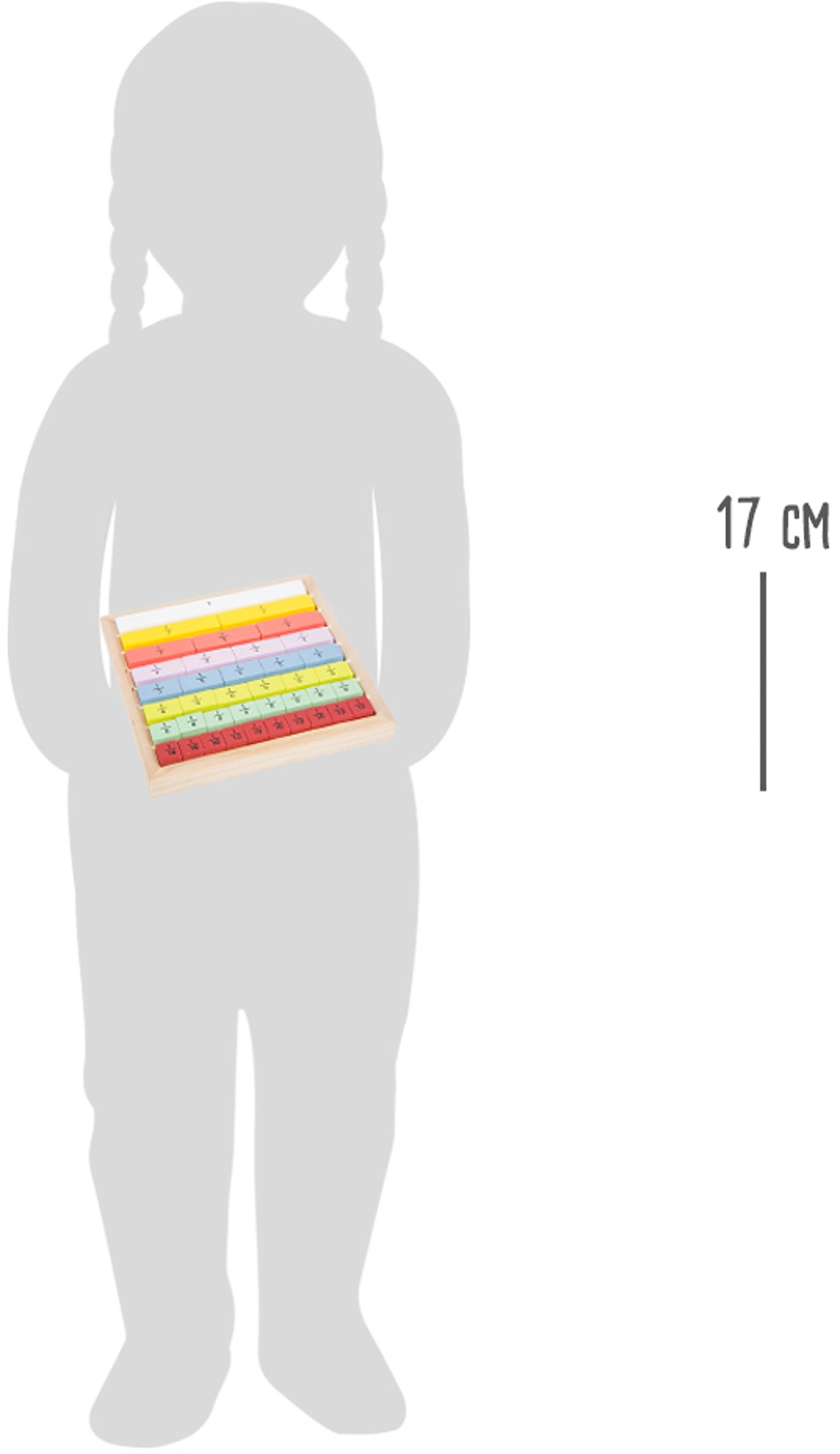 Αυτό το ποιοτικό εκπαιδευτικό βοήθημα από το εργαστήριο της Small Foot προσφέρει στα παιδιά έναν πολύχρωμο και παραστατικό τρόπο μάθησης. 39 ξύλινα κομμάτια διαφορετικών μηκών και χρωμάτων με εκτύπωση αριθμών βοηθούν στην κατανόηση της αρχής των κλασμάτων και της σύνθεσής τους σε ακέραιο. Χάρη στο ανθεκτικό ξύλο από 100% FSC πηγές, το παιχνίδι είναι ανθεκτικό και φιλικό προς το περιβάλλον.