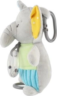 Ο ιδανικός σύντροφος παιχνιδιού για την κούνια ή το καρότσι χάρη στο ασφαλές κλιπ που επιτρέπει εύκολη ανάρτηση. Η υφή με ανάγλυφο του ελέφαντα ενθαρρύνει τη σωματοαισθητική εξερεύνηση, ενώ ο πολύχρωμος σχεδιασμός του τραβά το βλέμμα του παιδιού.