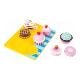 Προσφέρετε στα παιδιά παιχνιδιάρικο «ψήσιμο» χωρίς ψίχουλα! Αυτό το ξύλινο σετ επιδορπίων σε δίσκο προσφέρει 13 κομμάτια για ατελείωτους συνδυασμούς και φαντασία. Κάθε γλυκό αποτελείται από δύο μέρη ενωμένα με αυτοκόλλητο σκρατς, ώστε να μπορούν να εναλλάσσονται όπως θέλουν. Ανθεκτική ξύλινη κατασκευή, ασφαλή χρώματα και ανάπτυξη λεπτής κινητικότητας και επικοινωνίας κάνουν αυτό το σετ ιδανικό συμπλήρωμα για την παιδική κουζίνα ή το παιχνιδόμαγαζο.