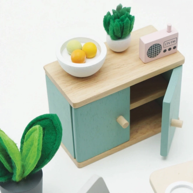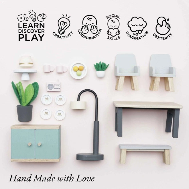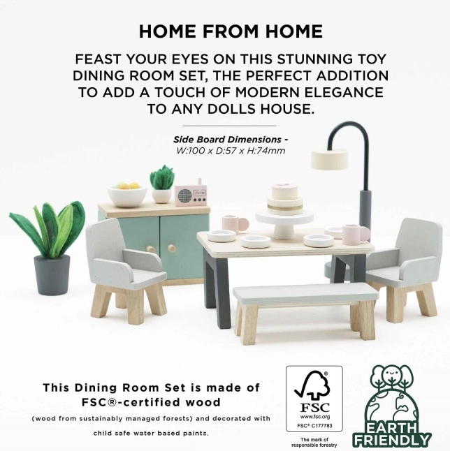 Αυτό το γοητευτικό σετ τραπεζαρίας είναι κατασκευασμένο από ποιοτικό ξύλο πιστοποιημένο από το FSC και φέρνει σε κάθε κουκλόσπιτο μια πινελιά κομψότητας. Περιλαμβάνει 18 στοιχεία, μεταξύ των οποίων τραπέζι, δύο πολυθρόνες, παγκάκι, λάμπα, μπουφέ και διακοσμητικά αξεσουάρ όπως φυτά, φρουτιέρα και τούρτα. Αυτό το σετ όχι μόνο δείχνει υπέροχο, αλλά επίσης υποστηρίζει τις γνωστικές και επικοινωνιακές δεξιότητες των παιδιών. Είναι διακοσμημένο με μη τοξικά χρώματα με βάση το νερό και είναι συμβατό με άλλα κουκλόσπιτα Le Toy Van Dolls.