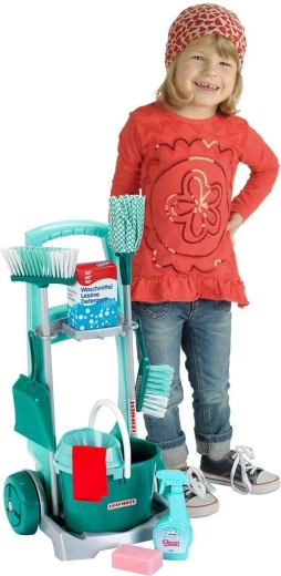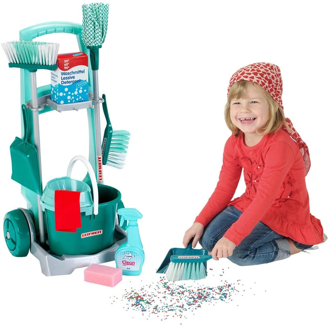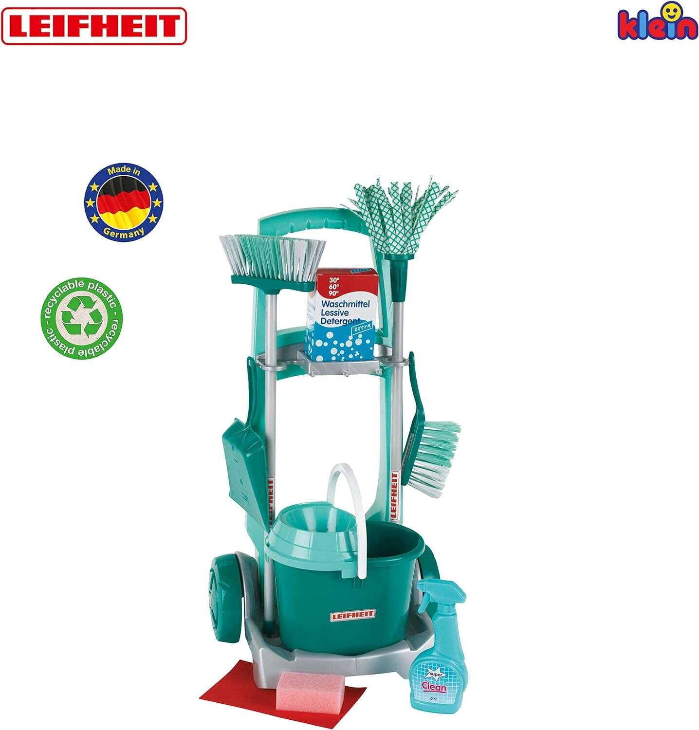 Στιλάτο παιδικό καρότσι καθαριότητας με άδεια LEIFHEIT από την KLEIN που προσφέρει ρεαλιστικό παιχνίδι «σπιτιού». Το σετ περιλαμβάνει καρότσι με ροδάκια, κουβά με στύφτη, σφουγγαρίστρα, σκούπα, φαρασάκι με βουρτσάκι και άλλα αξεσουάρ για μίμηση πραγματικού καθαρισμού. Χάρη στα ελαφριά υλικά και τις μελετημένες θήκες-στηρίγματα, όλα είναι εύκολα στον χειρισμό και έτοιμα για παιχνίδι. Ιδανικό για ανάπτυξη κινητικών δεξιοτήτων, εκμάθηση υπευθυνότητας και δημιουργικό role-play από 3 ετών.
