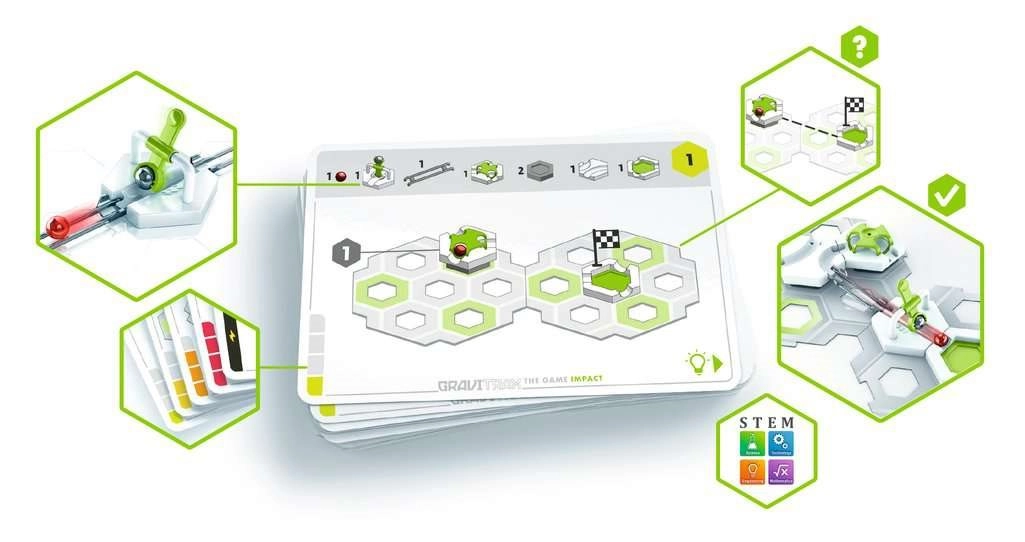 Το GraviTrax The Game Impact συνδυάζει συναρπαστικά την κατασκευή με το λογικό παιχνίδι. Στόχος σας είναι να δημιουργήσετε μια λειτουργική μπίλια-διαδρομή που θα συνδέει το καθορισμένο ξεκίνημα και τέρμα, χρησιμοποιώντας μόνο τα επιτρεπόμενα κομμάτια. Κάθε αποστολή είναι διαφορετικά σχεδιασμένη και σας οδηγεί στην ανακάλυψη φυσικών αρχών, στον προγραμματισμό και σε έξυπνες λύσεις.