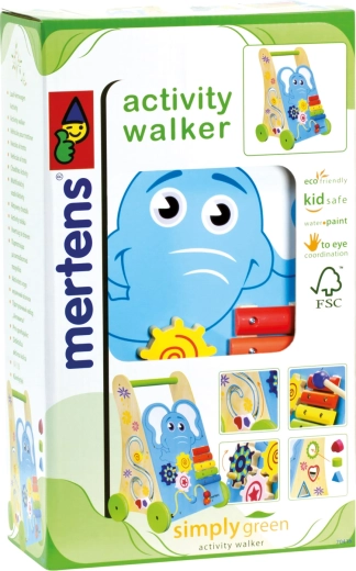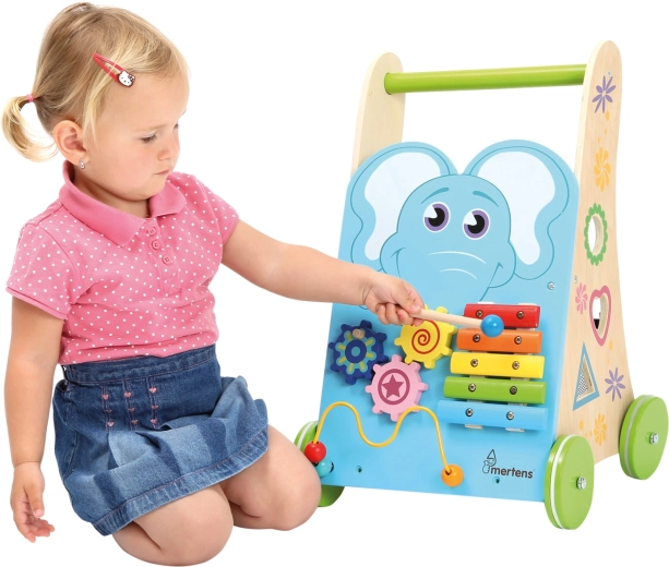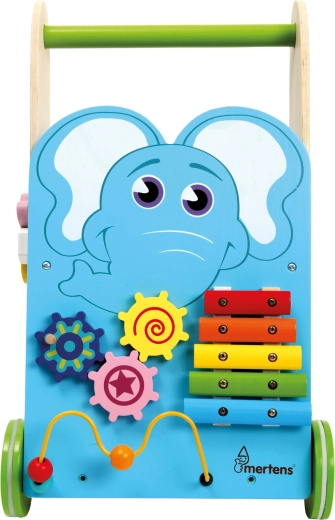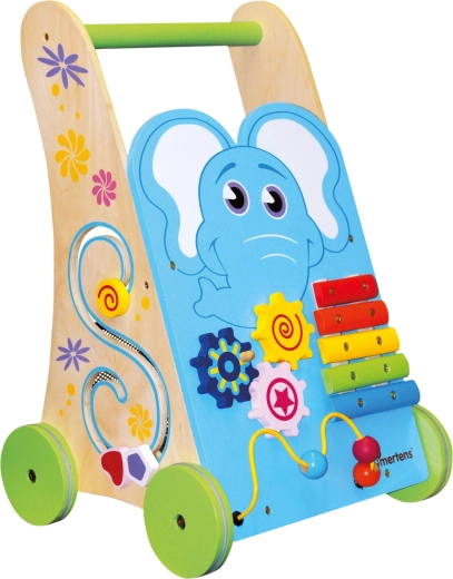 Το ξυλόφωνο με μπαγκέτα, οι οδοντωτοί τροχοί, ο λαβύρινθος με χάντρες και το παιχνίδι ταξινόμησης σχημάτων αναπτύσσουν λεπτή κινητικότητα, ακουστική αντίληψη και λογική σε μία συμπαγή περπατούρα.