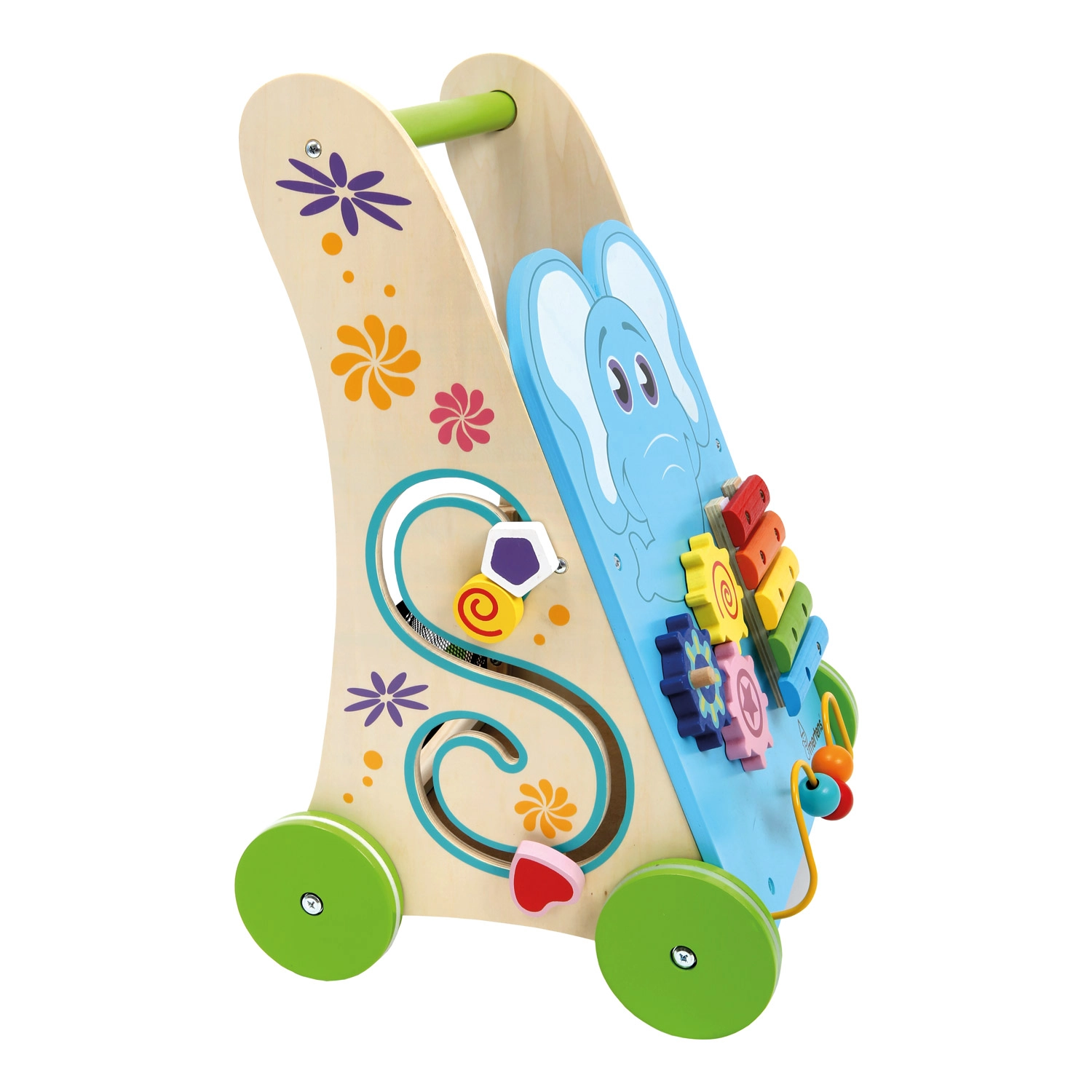 Υποστηρίξτε τα πρώτα βήματα και την πολύπλευρη ανάπτυξη του νηπίου σας με αυτή τη σταθερή ξύλινη περπατούρα με δραστηριότητες. Προσφέρει ξυλόφωνο με απαλό ήχο, λαβύρινθο με χάντρες, κουμπώματα σχημάτων και οδοντωτούς τροχούς για εξερεύνηση αιτίου και αποτελέσματος. Οι λάστιχενιοι τροχοί εξασφαλίζουν αθόρυβη κίνηση και προστασία του δαπέδου, ενώ η στιβαρή κατασκευή από 100% ξύλο FSC είναι ασφαλής και ανθεκτική.