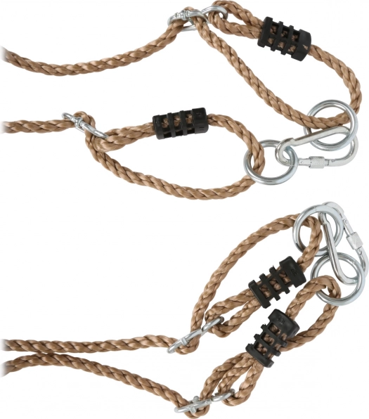Τα ανθεκτικά νάιλον σχοινιά με μεταλλικούς οδηγούς προσαρμόζονται εύκολα στο ύψος του παιδιού και στο σημείο ανάρτησης. Στα άκρα υπάρχουν μεταλλικοί κρίκοι και ασφαλείς καραμπίνες για γρήγορη και αξιόπιστη στερέωση. Η κούνια ταιριάζει στον κήπο και στο παιδικό δωμάτιο και χάρη στο μέγιστο φορτίο 100 kg την απολαμβάνουν μικρότερα και μεγαλύτερα παιδιά.