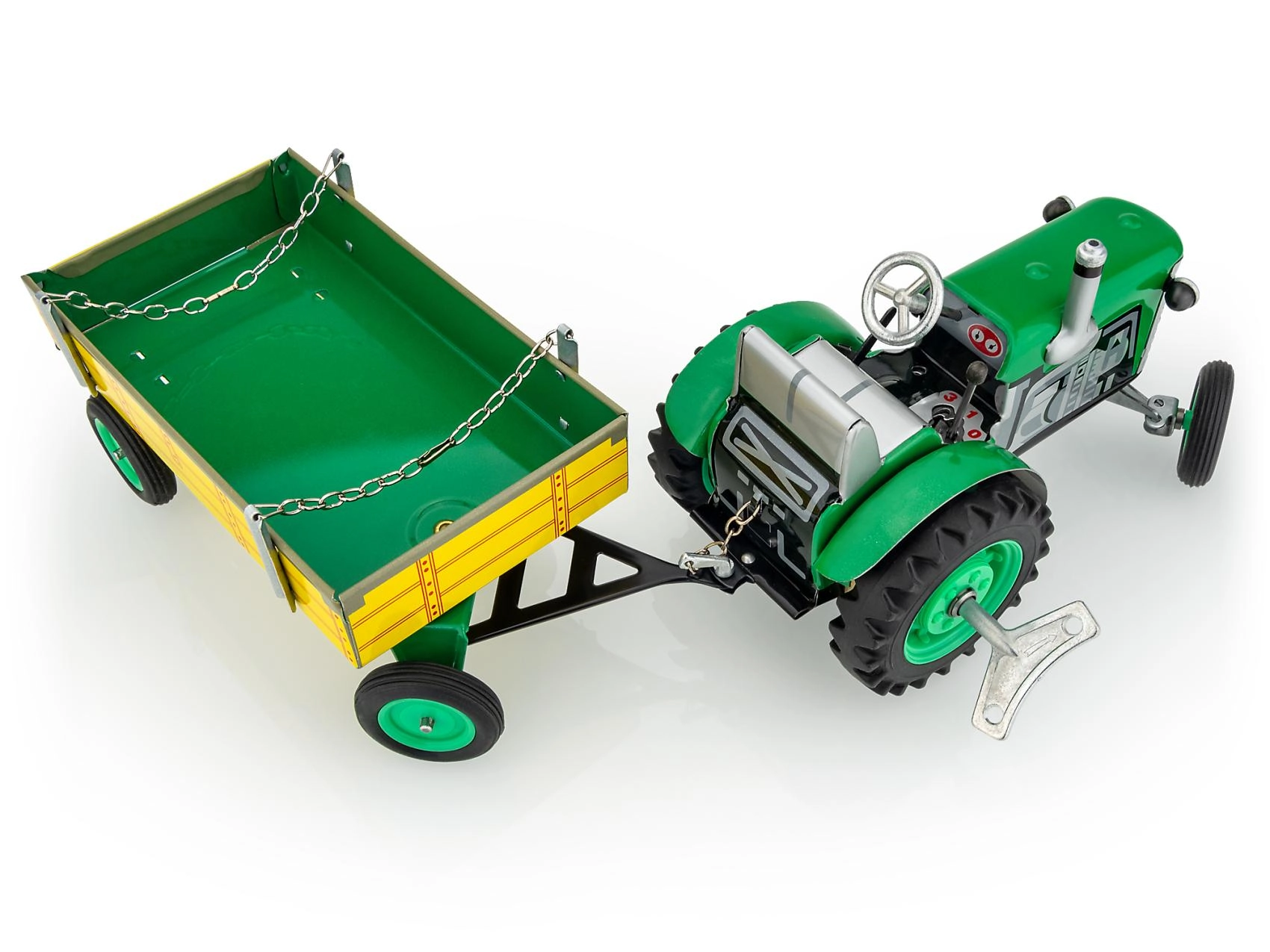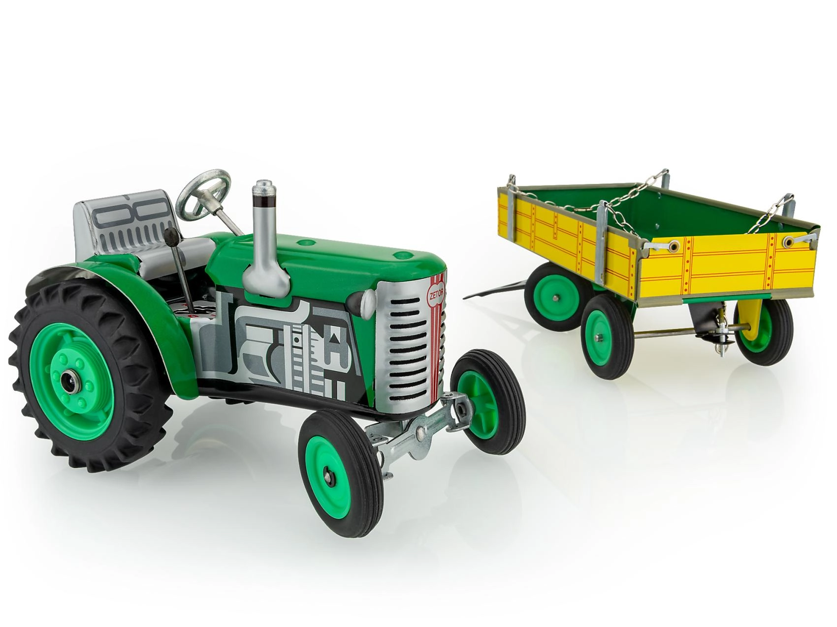 Ανακαλύψτε το αυθεντικό τσεχικό μοντέλο τρακτέρ Zetor με καρότσα, κατασκευασμένο από μέταλλο με έμφαση στη λεπτομέρεια και την αντοχή. Χάρη στον ελατηριωτό μηχανισμό με κλειδί, το τρακτέρ κινείται πραγματικά, ενώ το λειτουργικό κιβώτιο ταχυτήτων επιτρέπει επιλογή τριών ταχυτήτων εμπρός και όπισθεν. Τα παιδιά μπορούν να κατευθύνουν το τρακτέρ με το τιμόνι και να σταματήσουν με ασφάλεια χρησιμοποιώντας το χειρόφρενο.