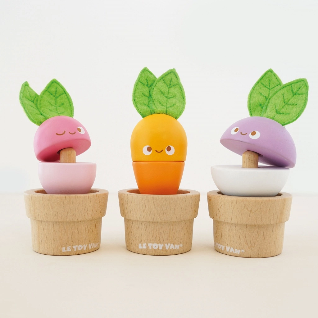 Το χαριτωμένο σετ ξύλινων γλαστρών με λαχανικά από την LE TOY VAN ενισχύει τη λεπτή κινητικότητα, τον συντονισμό χεριού–ματιού και τη φαντασία. Τα παιδιά μπορούν να αναμειγνύουν και να συναρμολογούν τα επιμέρους κομμάτια σε καρότο, ραπανάκι και παντζάρι ή να δημιουργούν δικούς τους συνδυασμούς. Το παιχνίδι είναι κατασκευασμένο από βιώσιμο ξύλο, έχει τσοχένια φύλλα και είναι χειροποίητα βαμμένο με μη τοξικά, υδατοδιαλυτά χρώματα.